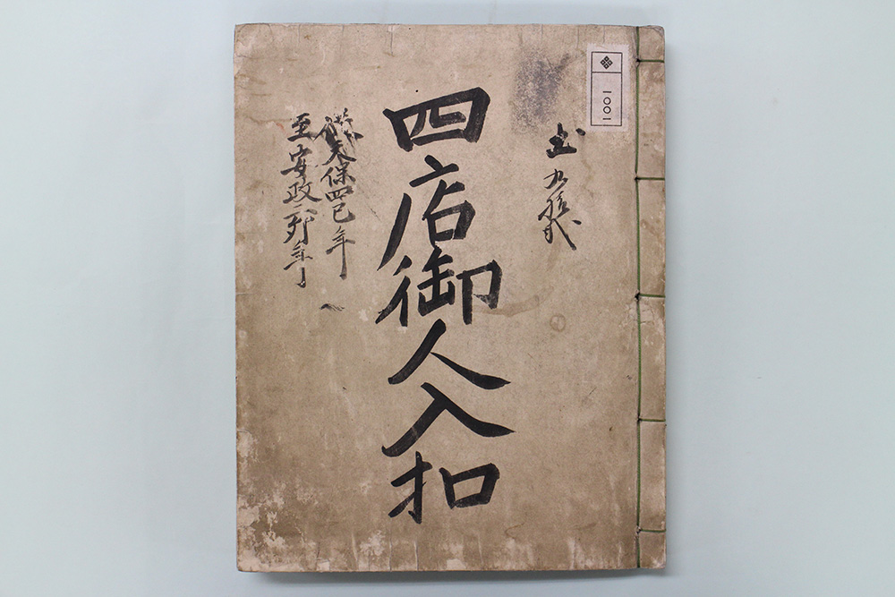 「四店御人入控」(本1001、以下人入控)は天保4年(1833)から安政2年(1855)の23年間、江戸と大坂の営業店の来店者数を、京本店で記録した冊子である。月日を入れた刷り物の集計用紙に毎日の人数を符帳で記載している。残念ながら競合他店の数値等は書かれていないが、越後屋の数字が継続的に長期間残っている点において唯一の史料である。人入控の数字を見ていくと、長期的な来店者数の増減傾向やイベント時の数字の変化などを一見して把握できる。例えば、大坂本店の天保11年11月8日を見ると、それまで「サシ」(50)~「ヱシ」(70)人前後で推移していた来店者が、突如「イ仙サ舟」(1500)人に跳ね上がっている。これは同店が大塩の乱で焼亡した店舗を再建し、見世開きを盛大に挙行したためである。人入控はこれまであまり活用されてこなかったが、帳簿類・日記類・書状類・重役らの意見書などと組み合わせることで、人入控の数字が越後屋の経営戦略や重役の経営判断に与えた影響など、小売店としての越後屋の姿をより詳しく描き出すことができるだろう。