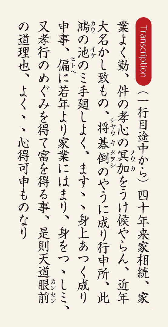 The money-exchanger Konoike Zenemon for forty years had a house, worked hard at the family business, and demonstrated filial piety. Perhaps it was due to his meritorious deeds, but while merchants who given loans to daimyo in recent years have been falling into ruin like dominoes, Konoike alone excelled at being diligent and grew more and more affluent. Devoting oneself to the family business wholeheartedly from a young age, behaving prudently, and acquiring wealth through meritorious deed of filial piety is correct as the path that one should follow. This is something that should be borne well in mind.