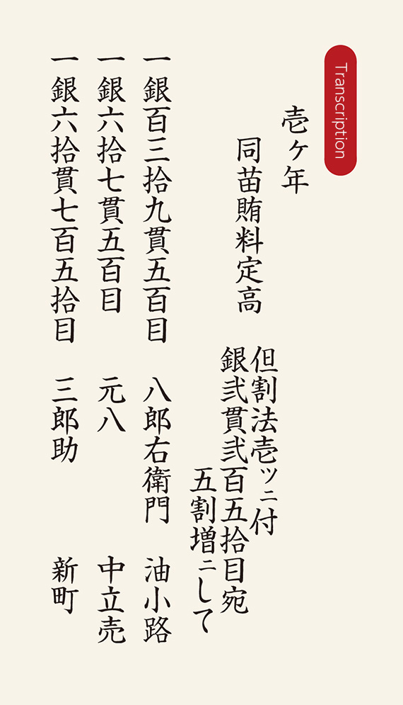 Living expenses for the Mitsui Domyo were calculated based on their distribution share as stated in the Sochiku Isho (→09). For example, the document above states that Takaharu, the fourth-generation head of the Kita family, residing in Kyoto Aburakoji, is to be allocated 139 kan of silver; Takakatsu, the second-generation head of the Isarago family, residing in Kyoto Nakadachiuri, is to be allocated 67 kan of silver; and Takahisa, the third-generation head of the Shinmachi family, residing in Kyoto Shinmachi, is to be allocated 60 kan of silver. The Omotokata was the entity responsible for administering the living expenses allocated to each family.