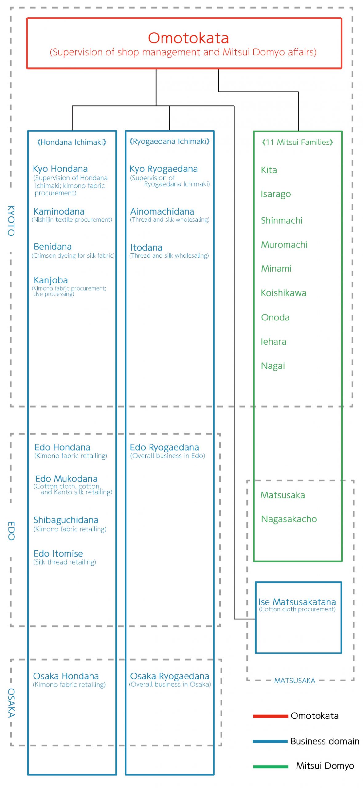 Mitsui had two business divisions, the kimono division (Hondana Ichimaki) and the financial division (Ryogaedana Ichimaki). The Mitsui Domyo consisted of six main families and five associate families (→06). In principle, the business divisions were held in common by all 11 families (Shinjo Itchi). With multiple families sharing assets and the management of two commercial domains, unified oversight of business and the Mitsui Domyo was required. The Omotokata was the administrative entity established in Kyoto to accomplish this aim.