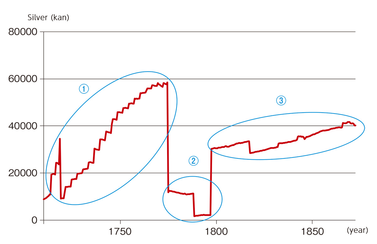 (1) 1710 to 1774 The initial revenue surge is attributable to shop profits remitted to the Omotokata after its establishment. The switch from gold to silver in 1718 reduced the book value to less than half, but assets rose sawtooth-fashion thereafter. This was due to steady accumulation of profits by the kimono and financial divisions during the three-year fiscal terms. The peak was reached in 1774, as noted.