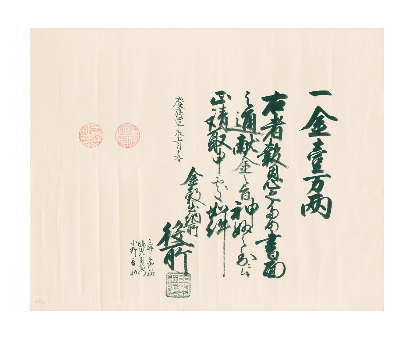 It pleases (the new government) highly to affirm that a contribution (of 10,000 ryo) has been made, and that the stated amount has been received.