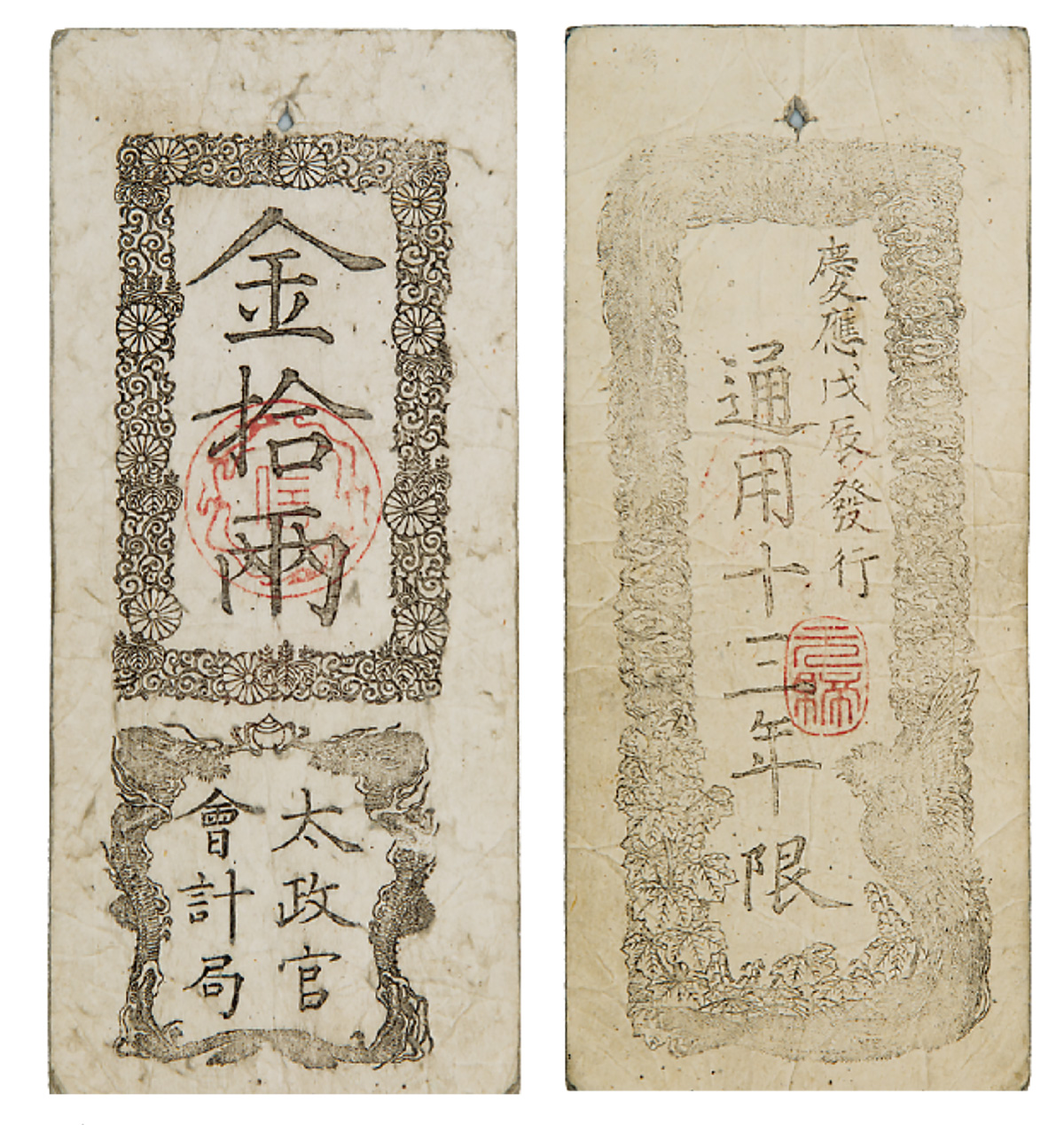 From the beginning, the new government found itself short of funds, including funds to promote industrial development. Consequently, the government launched its first paper currency, the Dajokan banknote (→Fig. 23c) in May 1868. But the new government’s authority was still weak, and it lacked the power to enforce the use of its currency. Moreover, trust in the new notes was low; circulation was limited to the Kyoto-Osaka region, and their value declined rapidly.