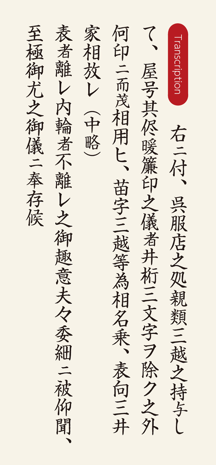 After completing some internal arrangements, in March 1872 Mitsui decided to focus on establishing a bank, and accepted the separation of the kimono stores. They set up a new, fictitious family called the Mitsukoshi family, taking the character mitsu from the Mitsui family name and the character echi (or etsu, but also pronounced koshi) from Echigoya, and separated the kimono business by transferring it to this new entity. They also dropped the stores’ traditional Igetasan emblem and replaced it with the character for koshi in a circle. As explained in the commentary on the historical documents at the end of this article, it is thought that this was the Mitsui family’s way of achieving the separation of the business, but with the intent of giving the appearance of a split while for all practical purposes keeping the kimono business in-house. At the end of the letter shown below, Takatoki and Takashige write that this move involved “top secret internal discussions,” and that it would be a “major incident” were the information to get out. One can see how the withdrawal from the kimono business was a major event for the Mitsui family.
