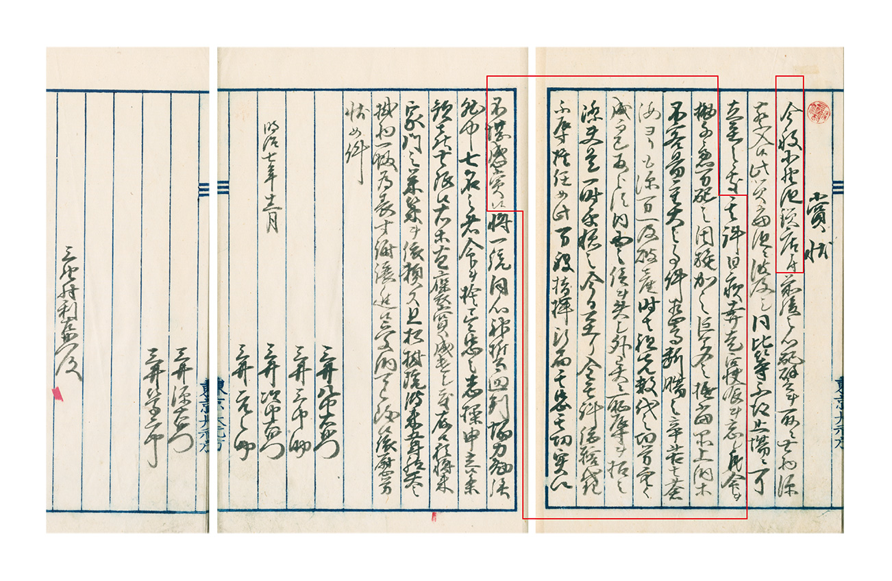 When Ono-gumi went bankrupt in 1874, Mitsui-gumi was facing a crisis of similar proportions. This letter is the ultimate expression of gratitude to Minomura and the other executives for their hard work. The document is addressed to a total of eleven individuals, including Minomura Rizaemon, as well as Nishimura Torashiro and Minomura Risuke (the adopted heir of Minomura Rizaemon).