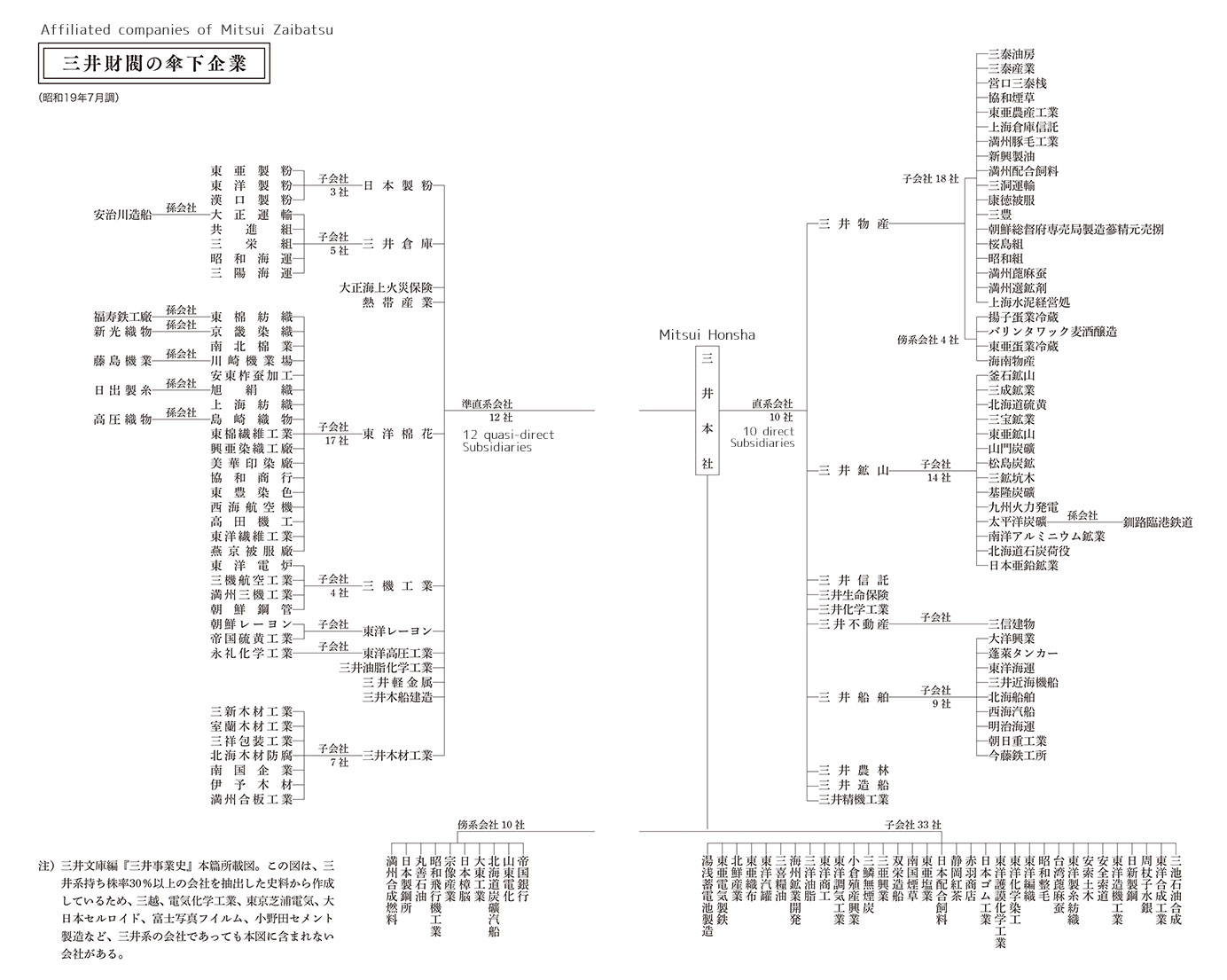 In September 1944, Mitsui Honsha designated 10 direct subsidiaries and 12 quasi-direct subsidiaries. The extent of Mitsui zaibatsu-affiliated companies at the time was as shown in the diagram below. (→Fig. 48d)