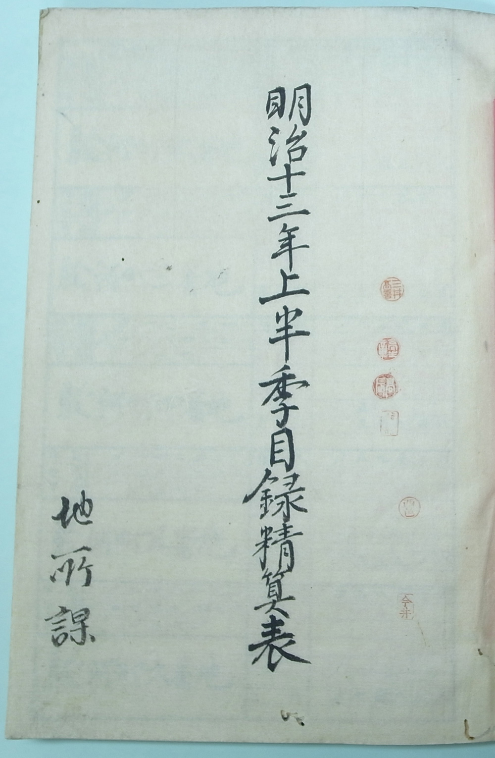 私の「一点」は、明治前期における東京の不動産経営史料[「目録精算簿」明治8~12年(別2413~別2417)、「目録精算表」明治13~14年(別2451-1~4)、「目録計算調表」明治15~16年(別2387-1~4)]である。近世の江戸町屋敷経営を代表する両替店請40箇所では地面の入れ替わりもなく、「地代宿賃勘定目録」(続5945~続6096、本2085、本2092)が毎年春秋の二季に一定の様式で作成されていたため、たとえ100年分に及んだとしても収支データを収集しやすかった。ところが、明治期に入ると、不動産経営帳簿の書式は度々変更された。たとえば、「目録精算簿」は縦書きで、くずし字で記録されている点では近世の「勘定目録」を踏襲しているが、次の「目録精算表」・「目録計算調表」になると、漢数字を使用しつつ、横書きかつ楷書体で描かれた表形式の帳簿へと変化する。