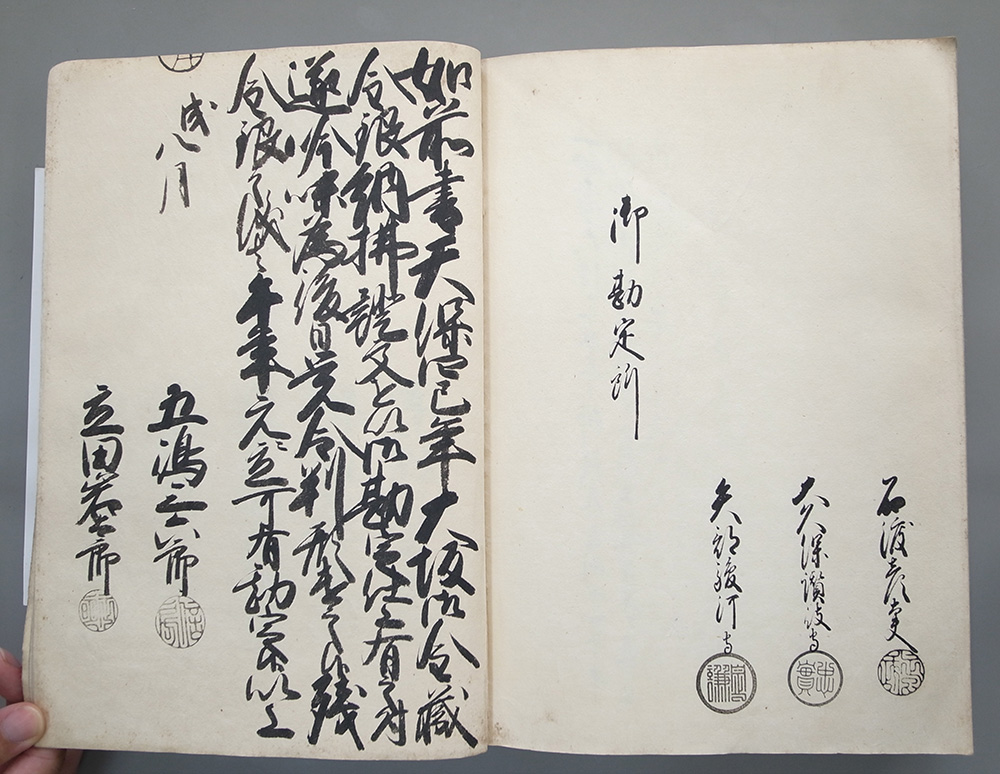 この2冊は年次こそ異なるものの、全く同じ性格の史料で、大坂町奉行・大坂御金奉行・大番ら6人が勘定を仕上げて幕府勘定所に提出し、老中・若年寄・勘定奉行・勘定吟味役・勘定組頭が奥書・奥印して大坂町奉行らに渡したもので、大量の数字記載には計算の誤りが全くなく、原史料正本の重みを持つ。納方は畿内筋以西の幕領年貢類を主とし、ほかに御用金や返納金銀・払米代銀など、渡方は大坂・京都の諸経費のほか在番加番合力金や助成金銀で、差し引きの剰余も多く、江戸金蔵への為替金送付に三井組も関与している。