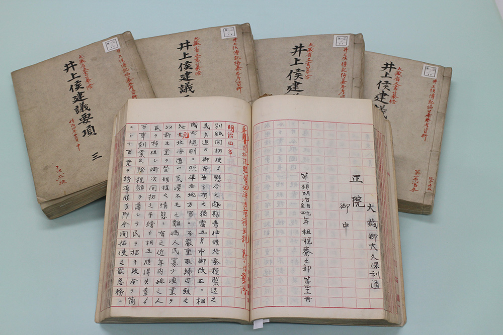 なお、「井上侯建議要項」第一原写本は、本来は全部で7冊あるはずのものなのですが、三井文庫には1・3・4・5・6の5冊しかありません。実は、東京大学経済学部資料室にも井上の伝記編纂事業に用いられた文書が所蔵されており、その中に「井上侯建議要項」2・7があるのです。二つの所蔵機関に分かれて保存されているという点も、他の史料にはない「井上侯建議要項」第一原写本の特徴と言えます。