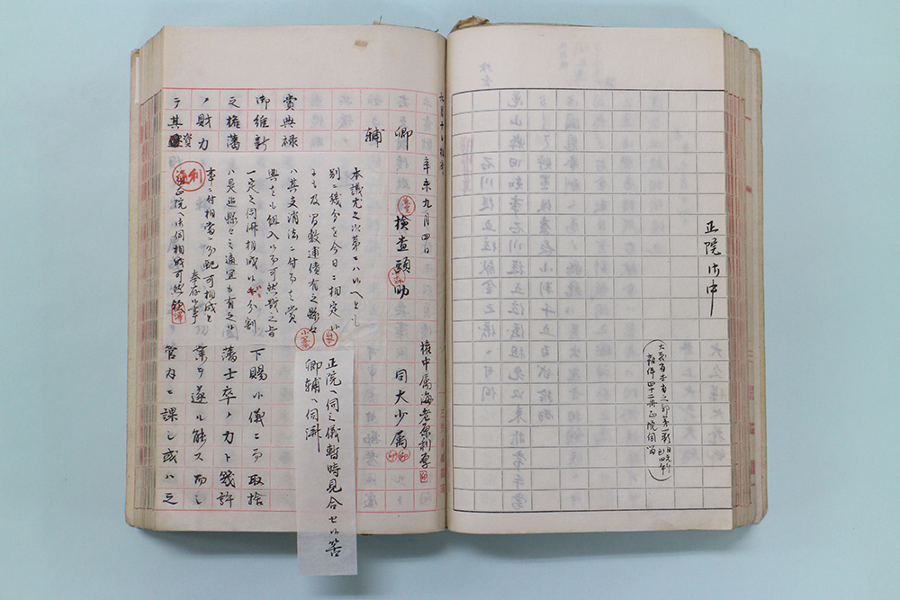 その中でも「井上侯建議要項」第一原写本は、原本のもつ情報をふんだんに盛り込んでいる点に最大の特長があります。筆写の担当者によって精粗はありますが、文書の表題や本文といった文字情報はもちろんのこと、省内での稟議の際に意見を記した付箋や、決裁に用いられたハンコの印影、参考のために添付された絵図までもが忠実に書き写されています。これらの情報を綜合することで、大蔵省がどのように組織としての意思決定を行っていたのかを再現することが可能です。