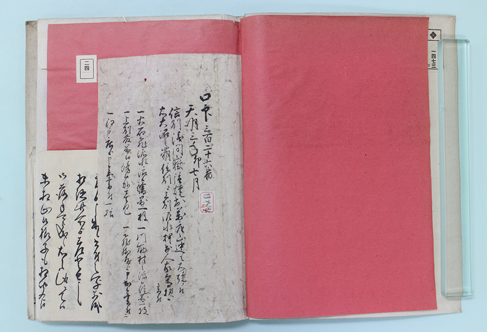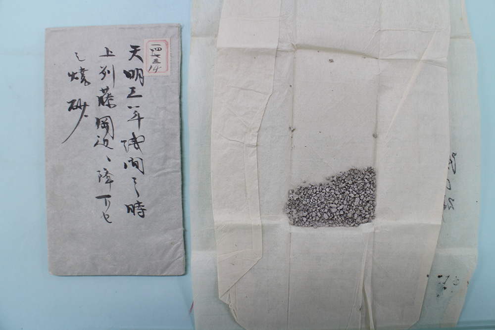 「天明三年卯七月信州浅間嶽強焼出万座山迚も大焼ニ付右大沼之崩信州より上州泥水押出人家等損候書付」(本1473-23)と外題の付けられた袋には、天明浅間山噴火(天明3年〔1783〕7月)の状況を伝える「火石飛泥水流候絵図」「川筋村々流候絵図」などの絵図5枚、飛脚屋からの通報(島屋佐右衛門書付)、江戸からの書状(近江屋五兵衛)のほか、「上州藤岡へ降候砂」一包などが収められていた。江戸店に届けられた藤岡へ降った砂の包みを開けた時には、こんな所で一世紀以上前の火山灰(砂)をみることができるとは思ってもいなかったので、一種驚きにも似た感動を覚えた。