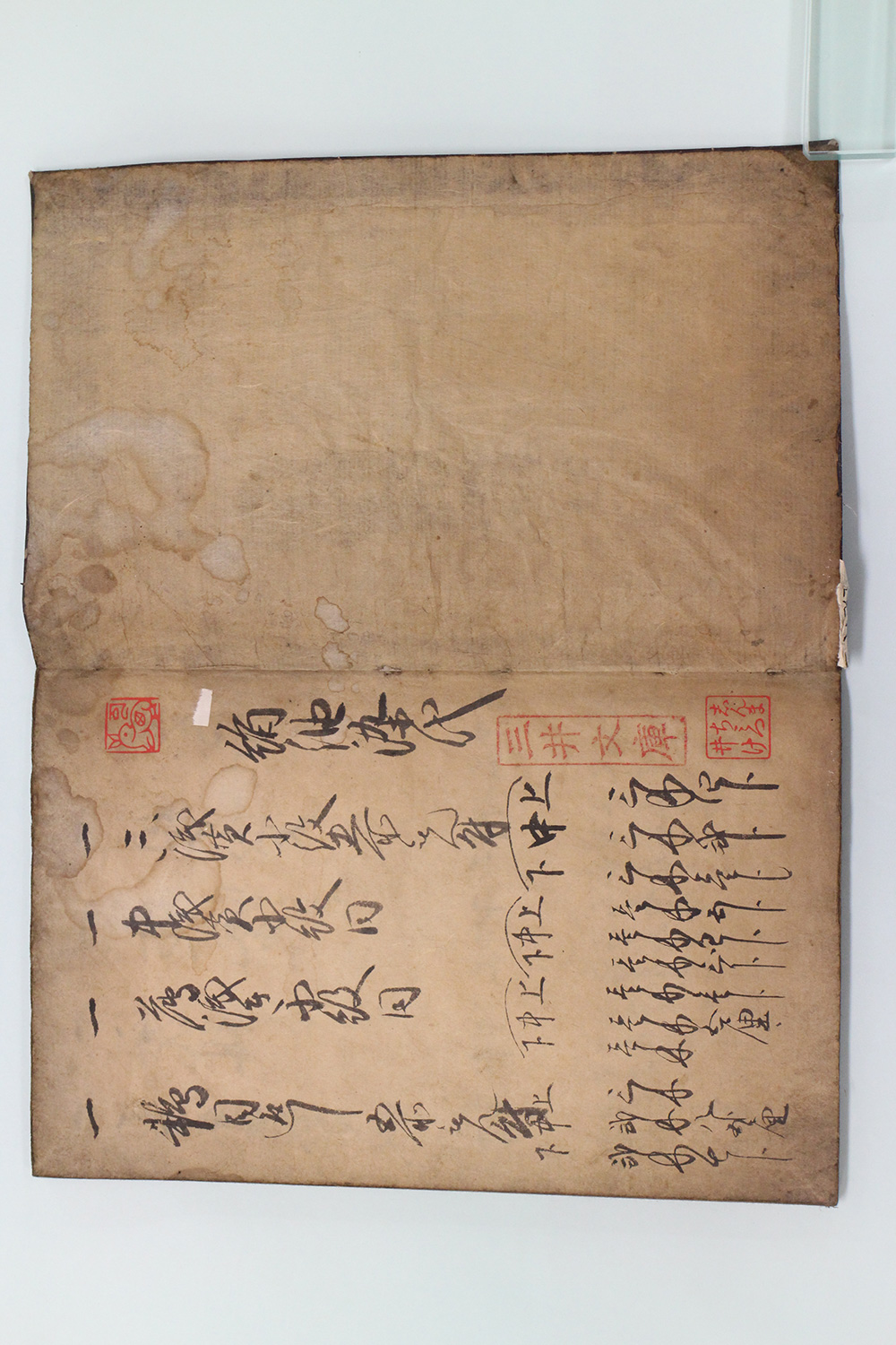 『染代覚帳』は縦26.5㎝、横18㎝、14丁から成り、多様な種類の染色・加工名称およびその価格が墨書されている。奥書や印記などから、この史料は天和3(1683)年当時に、上方の呉服屋で扱った染物の代金を写したもので、その後新町三井家8代または9代のコレクションとなったことがわかる。