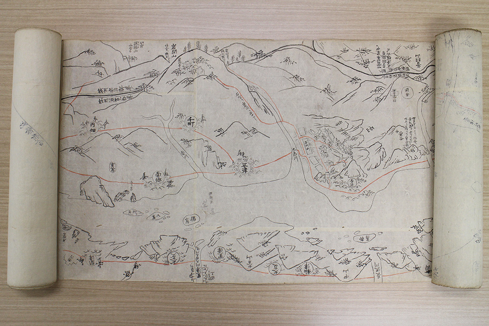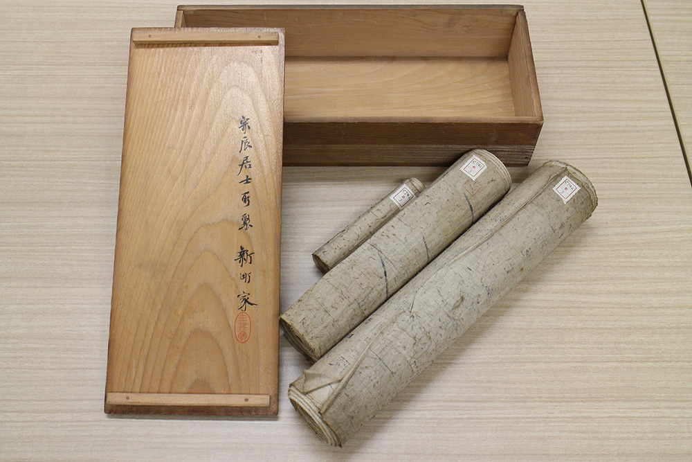 蓋裏に「宗辰居士所聚新町家」と墨書された木箱の中に、計3巻の図が収められている。それぞれ、山城国水垂から水尾峠に至る桂川筋、琵琶湖から瀬田川・宇治川・淀川・神崎川筋、山城国八幡から大和国添上郡境に至る木津川筋を描いた巻に分かれている。各巻は非常に長大であるため、以前、1巻ずつ、3人がかりで展開や記録を分担して調査させていただいた。少しずつ広げて見てみると、いずれも横に長く料紙を継いで川筋を描いており、河道の屈曲を料紙を折り込んで表現する工夫がこらされていることが確認できた。また、河道や沿岸の地名には貼紙や墨書による修正・抹消が多数みられた。完成図ではなく作製途中の可能性が考えられる。3巻ともに、宝暦6年(1756)啓蟄という作製時期、そして「澤田員矩」との署名が記されている。員矩40歳の作であることがわかる。