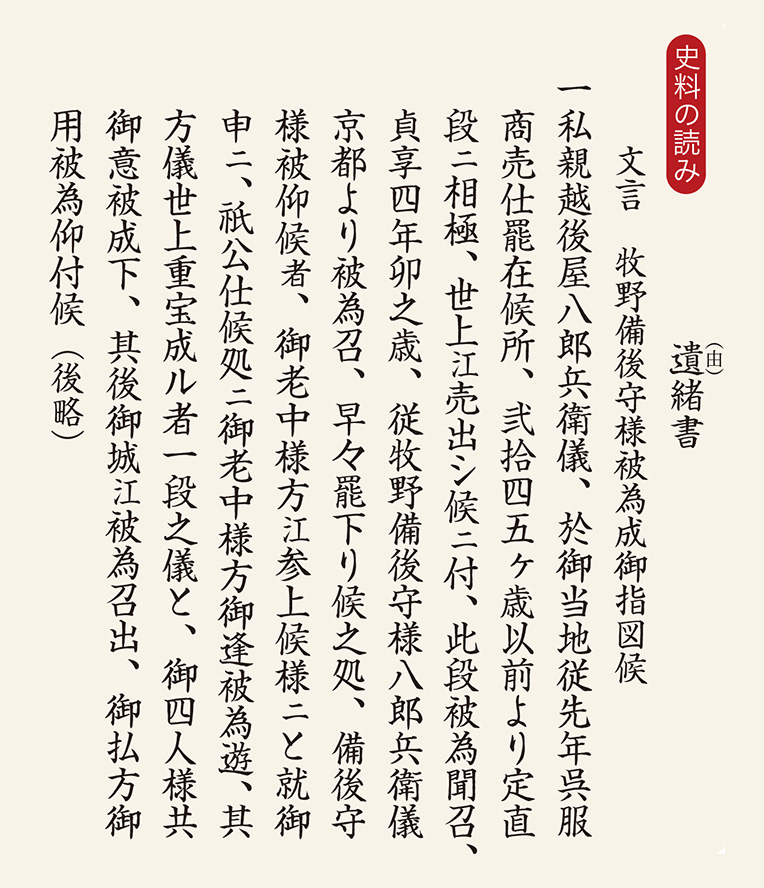 一つ、私(高久)の親である高平は、この江戸で以前から呉服商売をしており、24、5年前から定価を決めて世間に販売し、このことをお聞きになって、貞享4年(1687)に牧野様が高平を京都からお召しになり、早速江戸に下ったところ、牧野様が老中様方に御挨拶に参上せよと仰せなので、伺ったところ、4名の老中様が面会してくれ、おまえは世の中の役に立つもので結構であると、4名ともに仰せになり、その後江戸城へ召し出されて、払方御納戸の御用を命じられた。