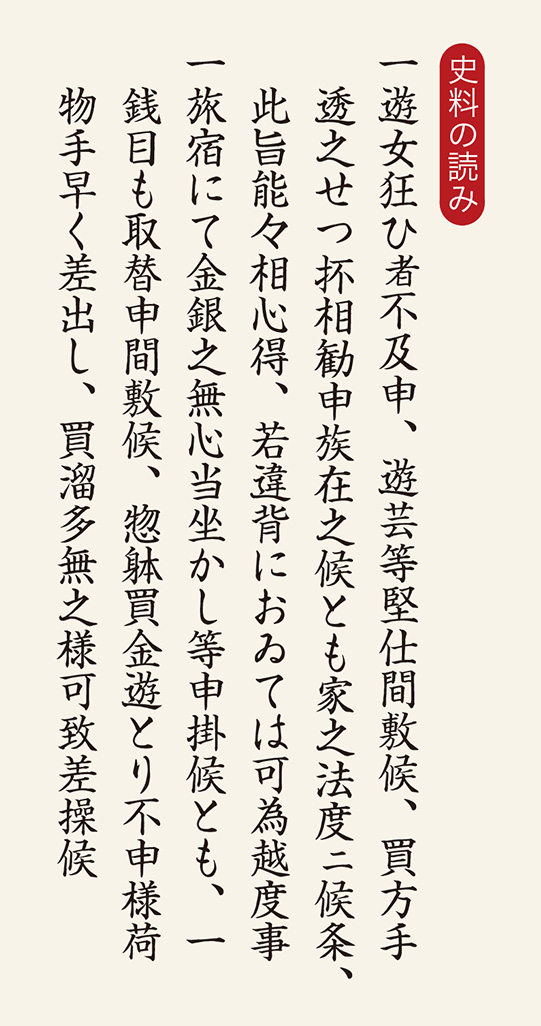八王子買方式目は全16ヶ条あり、ここには3、4ヶ条目を載せた。3ヶ条目では遊女狂いはもちろん、遊芸も厳禁とすること、4ヶ条目では仕入金を他の目的に使わないことなどを定めており、手代としての心構えが書かれている。