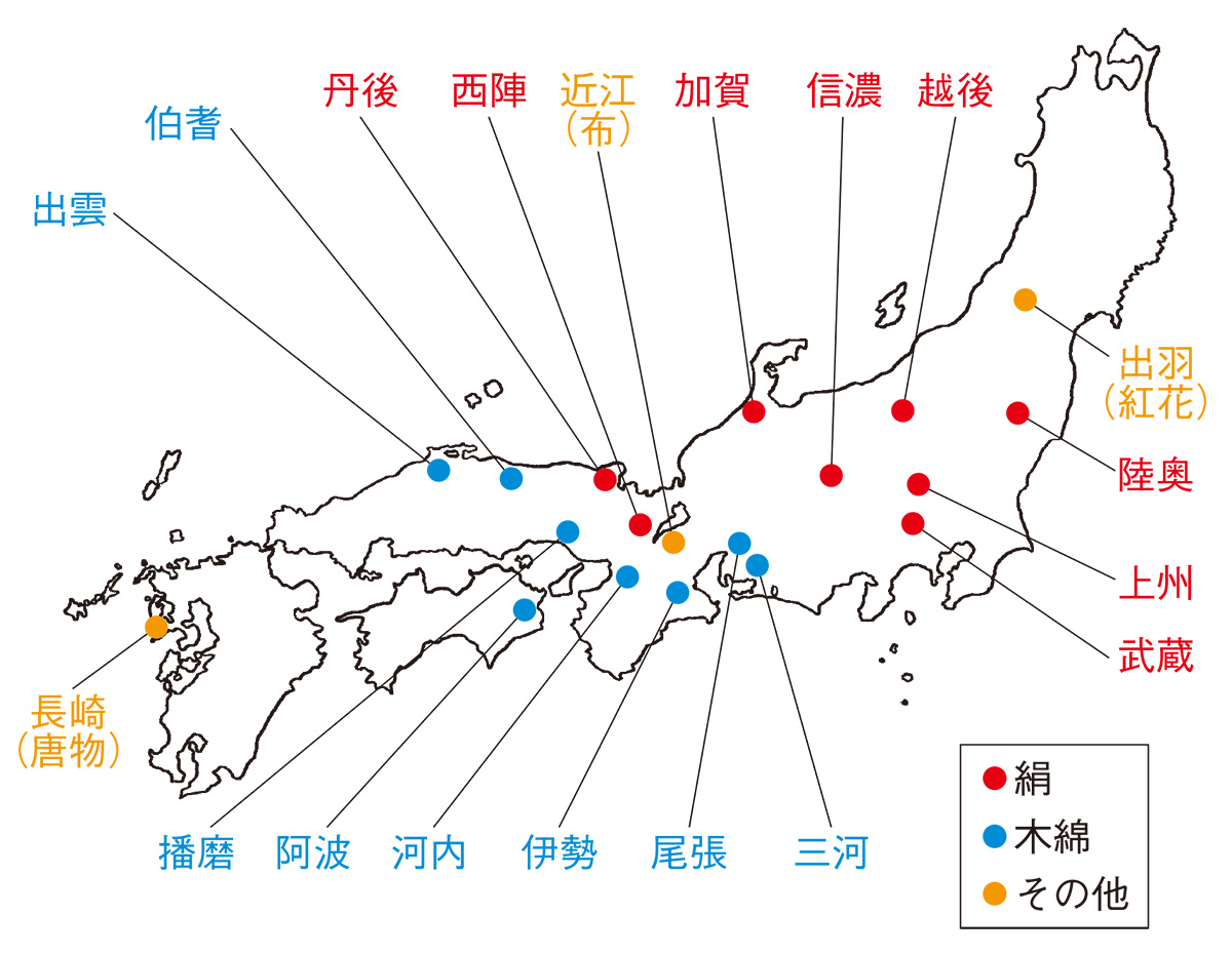三井の呉服部門である三井越後屋(以下、越後屋)では、産地が広がるにつれ、西陣物などの高級品のみならず、地方で生産される絹織物や、より安価な木綿も大量に仕入れるようになる。例えば、加賀・丹後・越後・上州桐生・武蔵などで織られた絹織物、伊勢松坂・河内・播磨・尾張・三河・伯耆・出雲などの木綿、近江の布などである(→越後屋の主要な仕入地と仕入品)。特に伯耆の木綿は他の問屋に先んじて仕入を始め、店内でも尾州木綿と称して産地の存在を秘匿していた。これらの仕入は京本店の担当だが、関東の絹織物・木綿類は江戸向店(→向店絵入木塗酒盃)が仕入と販売を行っていた。