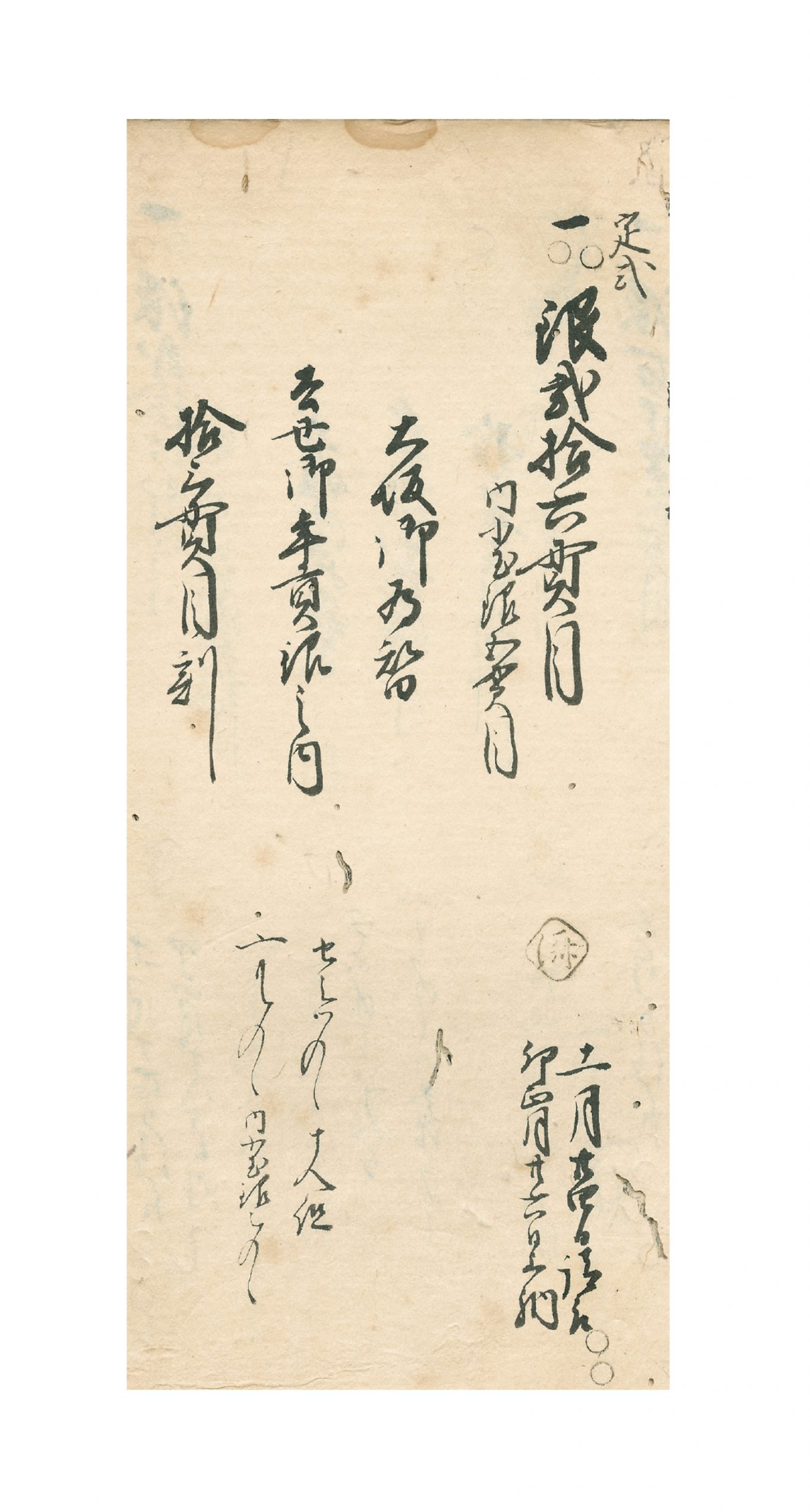 幕府の御為替御用の例である。上段右から、まず「定式」は定例であることを示す。続いて銀26貫目(金で約433両)という額と、小玉銀という貨幣の量の注記。「大坂御為替」は、「大坂御金蔵銀御為替」のこと。次に前年の年貢米を換金した銀であること。上段の最後は、大坂両替店がうけとった全額の半分を、京両替店が分担する意。下段に移り、「済」印は処理済を示す。日付は、大坂金蔵でうけとった日と、江戸金蔵に上納した日。最後に符丁(→19 奉公人1 昇進と報酬)で、同じ御用を担う両替商「十人組」の分担額と、合計額を記す。