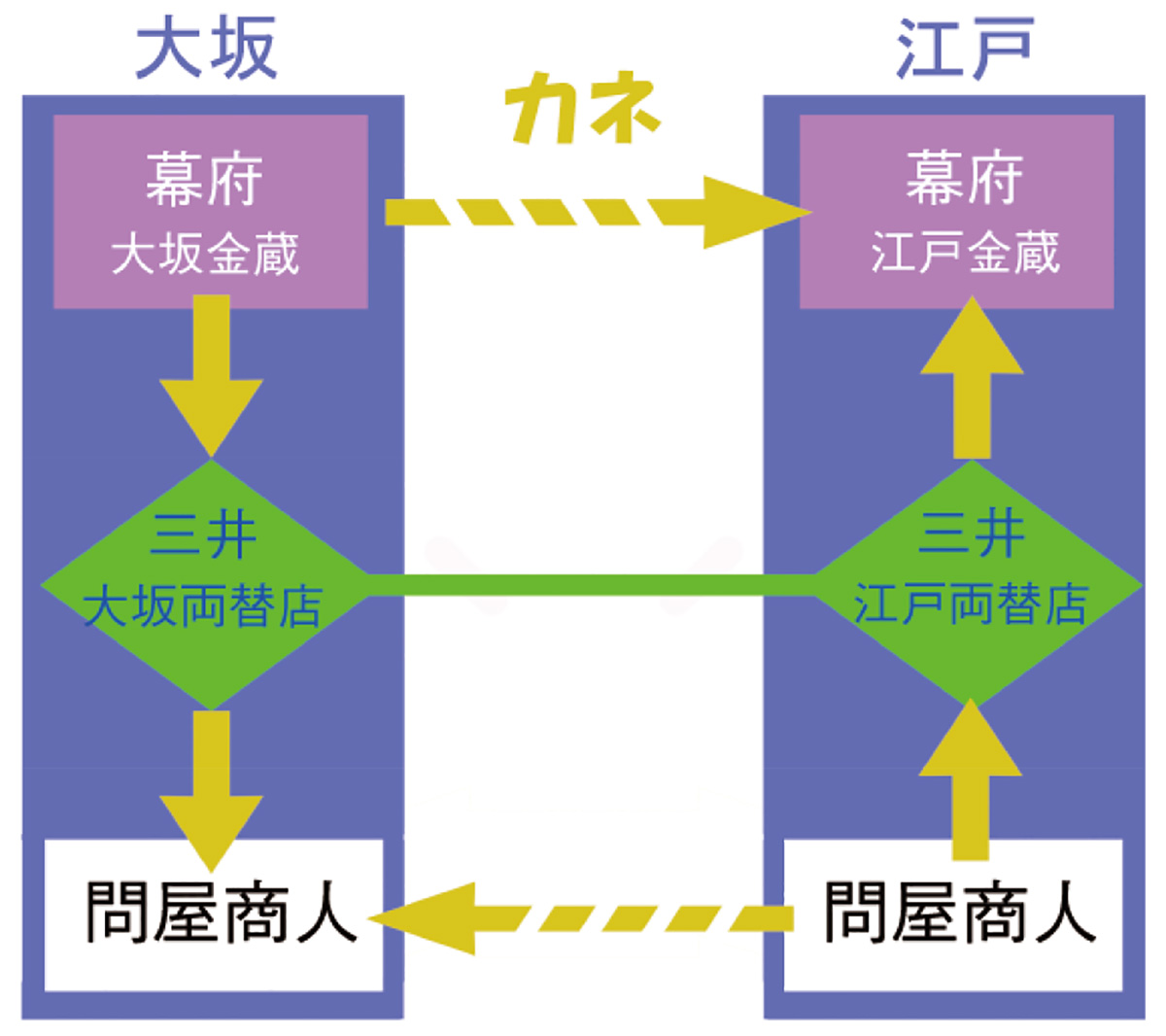 さらに三井らが担った御用(→御為替御用のしくみ)も大きな意味をもった。物資の集積地である大坂と、最大の消費地である江戸の間には、逆方向の二つの大きな送金の流れが存在した。江戸の問屋商人は、さまざまな物資の購入代金を大坂の問屋商人に支払う。逆に、幕府や大名は、領地で取り立てた年貢米などの農産物を大坂で換金した代金を、江戸へ送金する。三井などの両替商が、この両者をともに扱って相殺し、現金銀を運ぶ手間を省き、都市間の資金循環をスムーズにしていた。