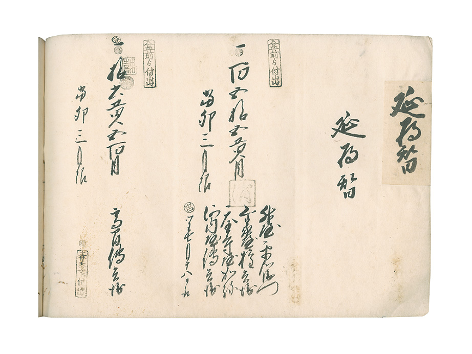 ともに盆前(前の半期)から継続することを示す印がおされ、返済期限はこの年3月とある。1口目は、閏7月に返済されたと記され、消印が押される。2口目は、当半期では返済がなく、春季(次の半期)の冊に転記したことが、印で示されている。他にも様々な印が押されており、経理処理や監査が何度も行われたことがわかる。