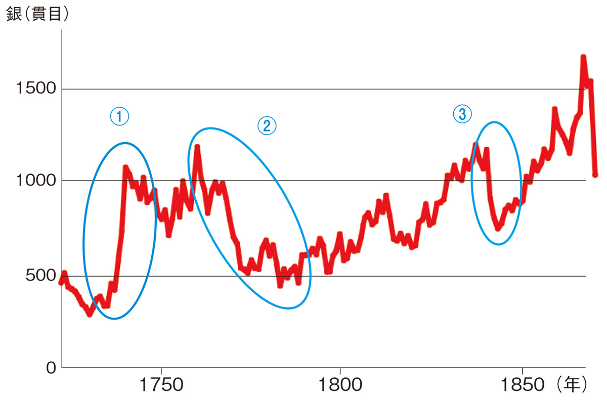 ③その後は三都で新たな融資先の開拓につとめ、やや低調ながら右肩上がりであったが、天保9年(1838)のピーク後の同13年、幕府の天保改革による大不況のため、業績が急激に悪化した。その後は好転し、銀相場の下落もあって、明治元年(1868)にピークを記録した。