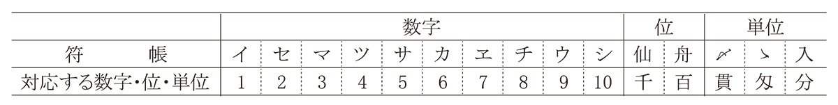 三井の呉服部門の史料で、売場担当者の販売成績と勤務日数の記録である。江戸と大坂の各営業店の数字を半年ごとに京本店で集約している。享保16年(1731)から明治3年(1870)まで、欠落もあるが約130年分の記録が残る。売上の数値はそれぞれ片仮名に置き換えられている。これは符帳という暗号で、江戸時代の商家はそれぞれ独自の符帳を用いて、帳簿の内容を一見でわからないようにしていた。三井では「イセマツサカヱチウシ」の符帳を多用していた。三井の符帳と数字・位・単位の対応表を下に示した。史料の読みに載せた売上額がいくらか、解読を試みていただければ幸いである。