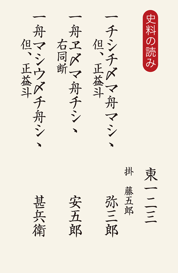 寛政9年(1797)下半期の売場手代の売上成績であり、江戸本店の東見世というブロックの一番から三番までの売場の記録である。責任者は藤五郎であり、東一番に弥三郎、二番に安五郎、三番に甚兵衛が就いている。それぞれ銀88貫330匁、107貫380匁、139貫810匁を売り上げている。これらは全て現金売であった。