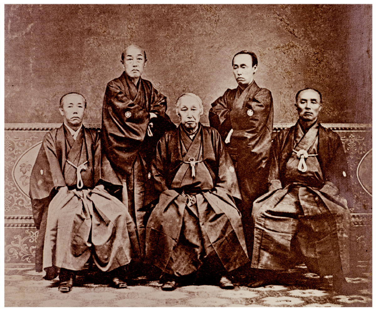 前列左から三井高喜、高福、三野村利左衛門、後列左から斎藤専蔵(純造)、三井高朗。