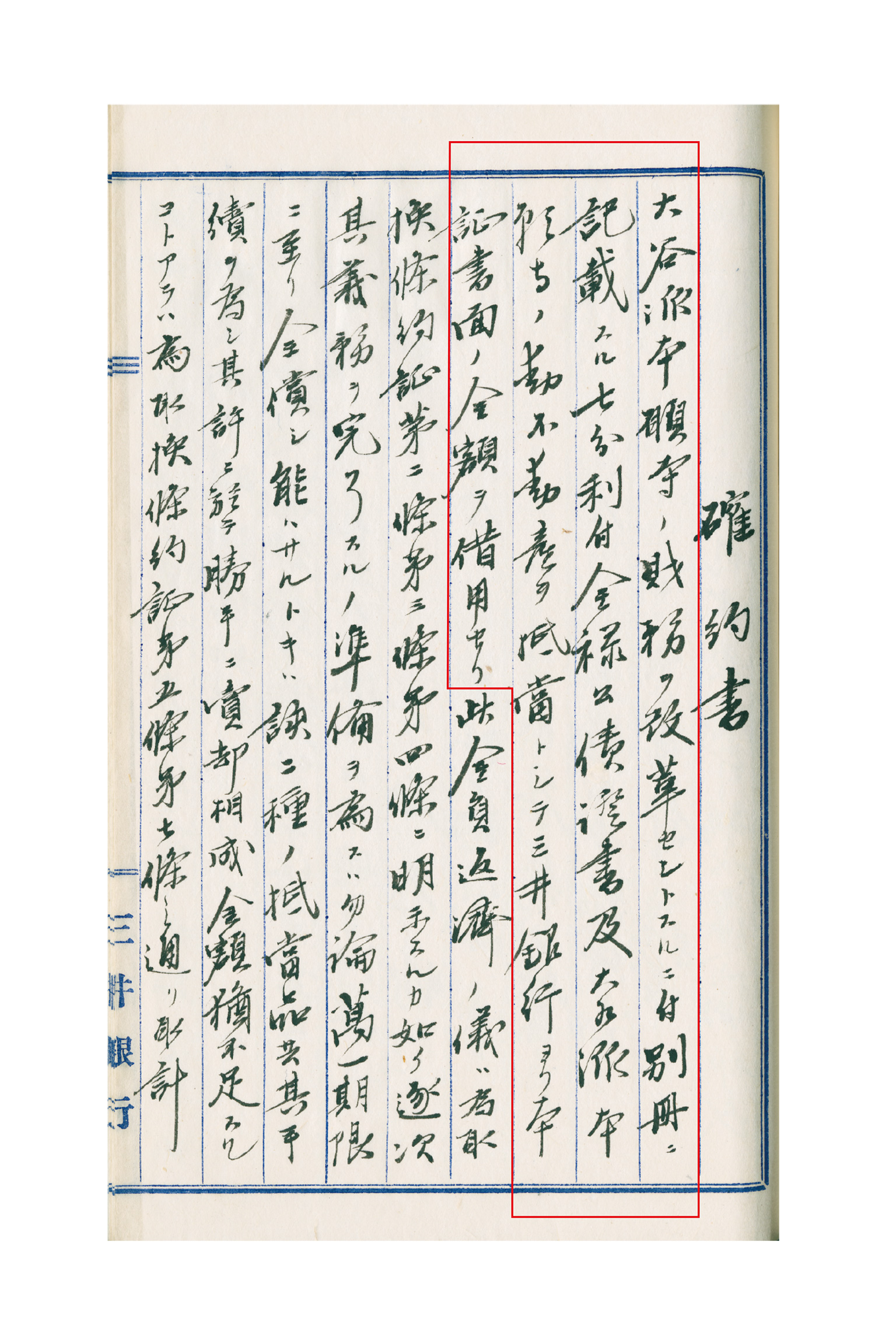 右の「確約書」は、三井銀行と真宗大谷派(東本願寺)との間で取り交わされた借用金に関する契約書類の写し(冒頭部分)。明治18年(1885)、三井銀行は負債を抱え込んだ東本願寺の再建に乗り出し、多額の融資を実施した。貸出金が回収されるまでの期間、東本願寺の財務に関する書類が三井銀行に提出されており、それが三井家に保存された(→東本願寺書類)