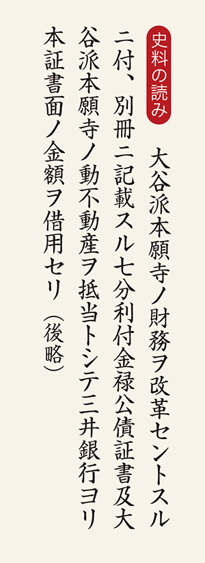 明治18年(1885)12月、大蔵大臣松方正義の要請を断れず、三井銀行は、東本願寺に30万円を融資するとともに、本山の財務改革を請け負うことになった。右の記事には、公債証書および動不動産を抵当に差し出す旨が記されている。