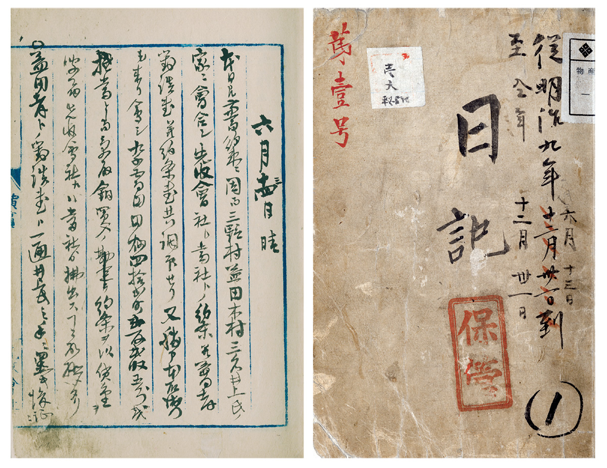 ここに掲げたのは、「日記」第1号の表紙と冒頭の記事である。明治9年7月1日の創立を前に、6月13日に井上馨邸でおこなわれた会談の記録で、「本日は兼而約束ニ因而三野村、益田、木村三名井上氏ノ家ニ会合シ先収会社ト当社〔三井物産―引用者〕トノ約条并益田孝対談書并約条書共調印セリ」とあり、先収会社の業務を引き継いでの三井物産創立が確定したことが記されている。初期の「日記」では、総轄・益田孝や副総轄・木村正幹が、自ら筆をとることが多かった。この日の記事は、益田が書いている。