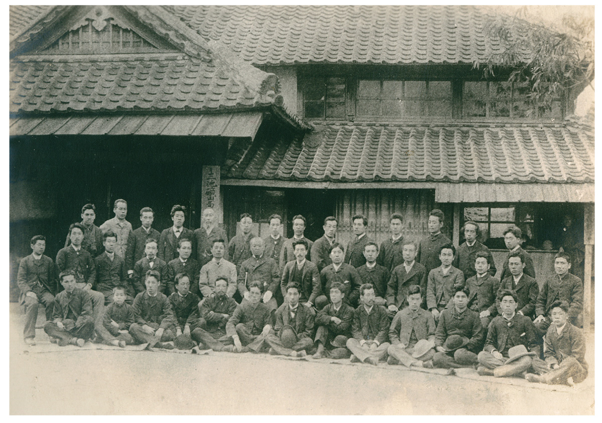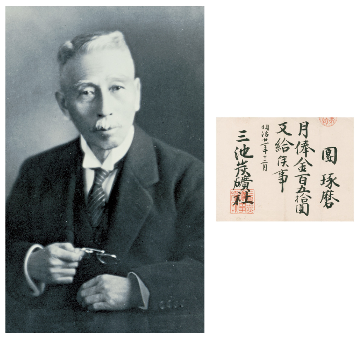 この写真は、明治22年(1889)1月、官営三池鉱山が三井組に引き継がれる際、三池鉱山局事務所の玄関で撮影されたもの。未刊に終わった「三井鉱山五十年史」が製作される過程でまとめられた「写真集」に収められている。
