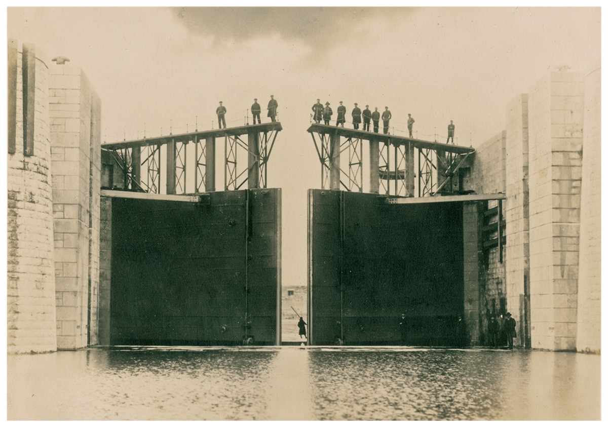 明治41年(1908)4月、三池港が開港した。上の写真は、三池港のドック入口に設置された閘門で、ドック内に海水を引き入れる直前に撮影されたもの。日本で唯一の閘門式のドックは、一部の修理・改修を経て、現在でも当時のまま利用されている。