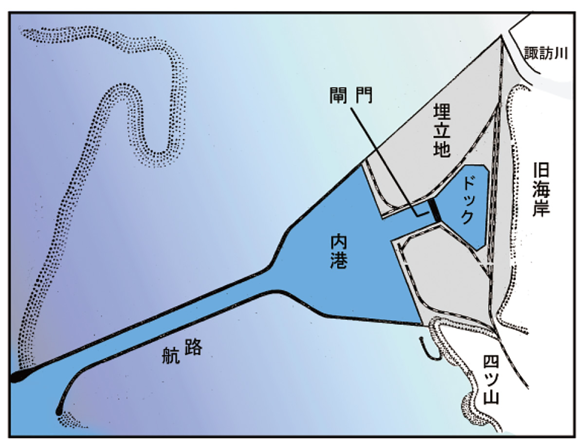 この築港工事は、下図のとおり、諏訪川より四ツ山の山麓にいたる約36万坪の区画を埋め立て、そのなかに4万坪のドックを築造する計画であった。また、ドックの外側には、15万坪の内港を設け、約1.8キロの突堤をもって外海につうじる航路をつくる設計であった。(→三池築港図)