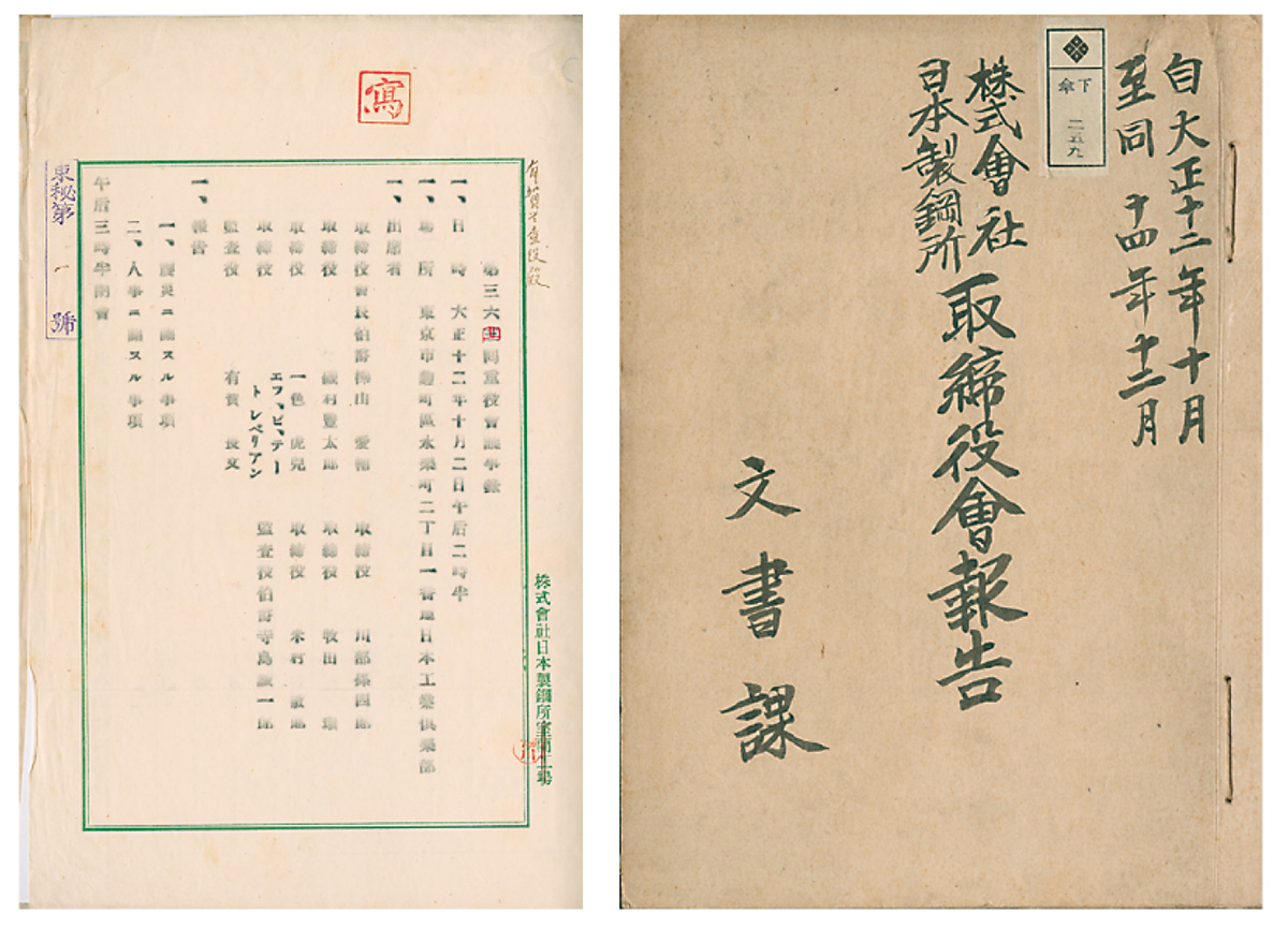 ここに掲げたのは、後に三井物産のトップを務めることになる石田礼助をカルカッタ支店長から大連支店長に転任させる案件などの人事議案である。左が、三井物産会社の取締役会議案で、社長以下取締役の押印があるが、これのみでは最終決定とはならない。右は、三井合名会社へ提出された同議案に添付された三井合名会社議案用箋で、承認の印に、三井合名会社社長・三井高棟、理事長・団?磨の花押などが記されている。