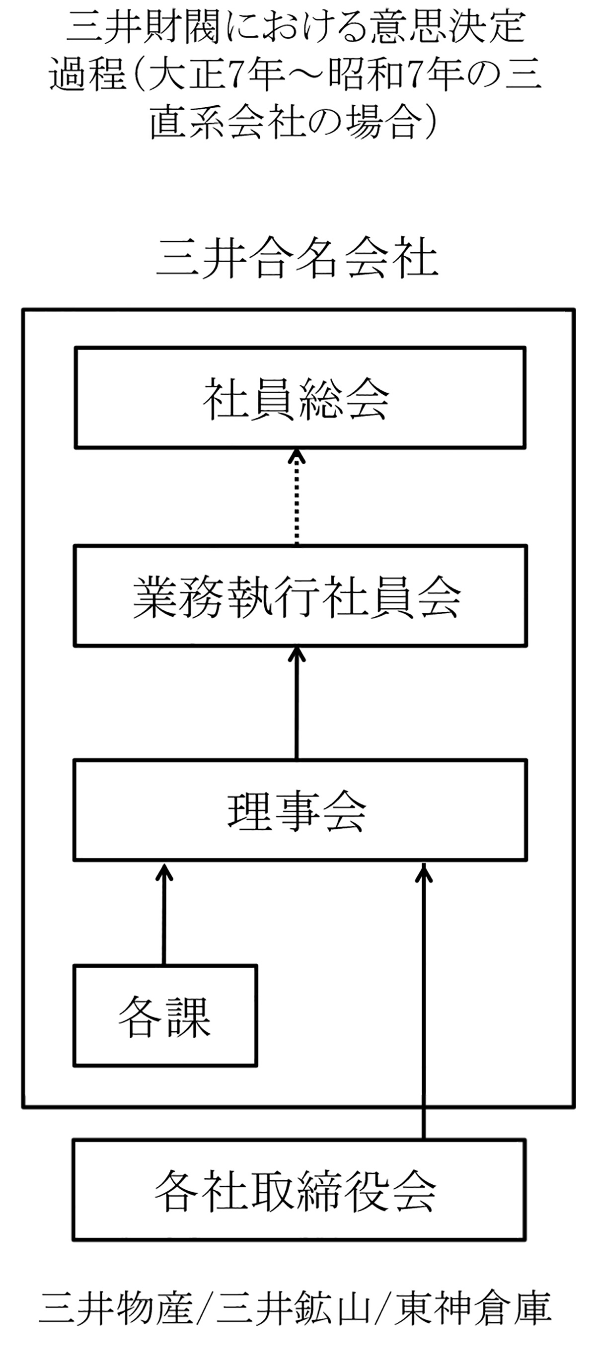 三井合名会社の最高議決機関は三井11家の当主である社員が構成員となる社員総会であったが、開催は年に数回程度で、附議される案件は、三井合名会社の決算、重要人事、新規子会社の設立などごく限定されたものだけであった。特に定められたもの以外は、三井家同族(3~4名)が務める業務執行社員会で決定されることになっていた。