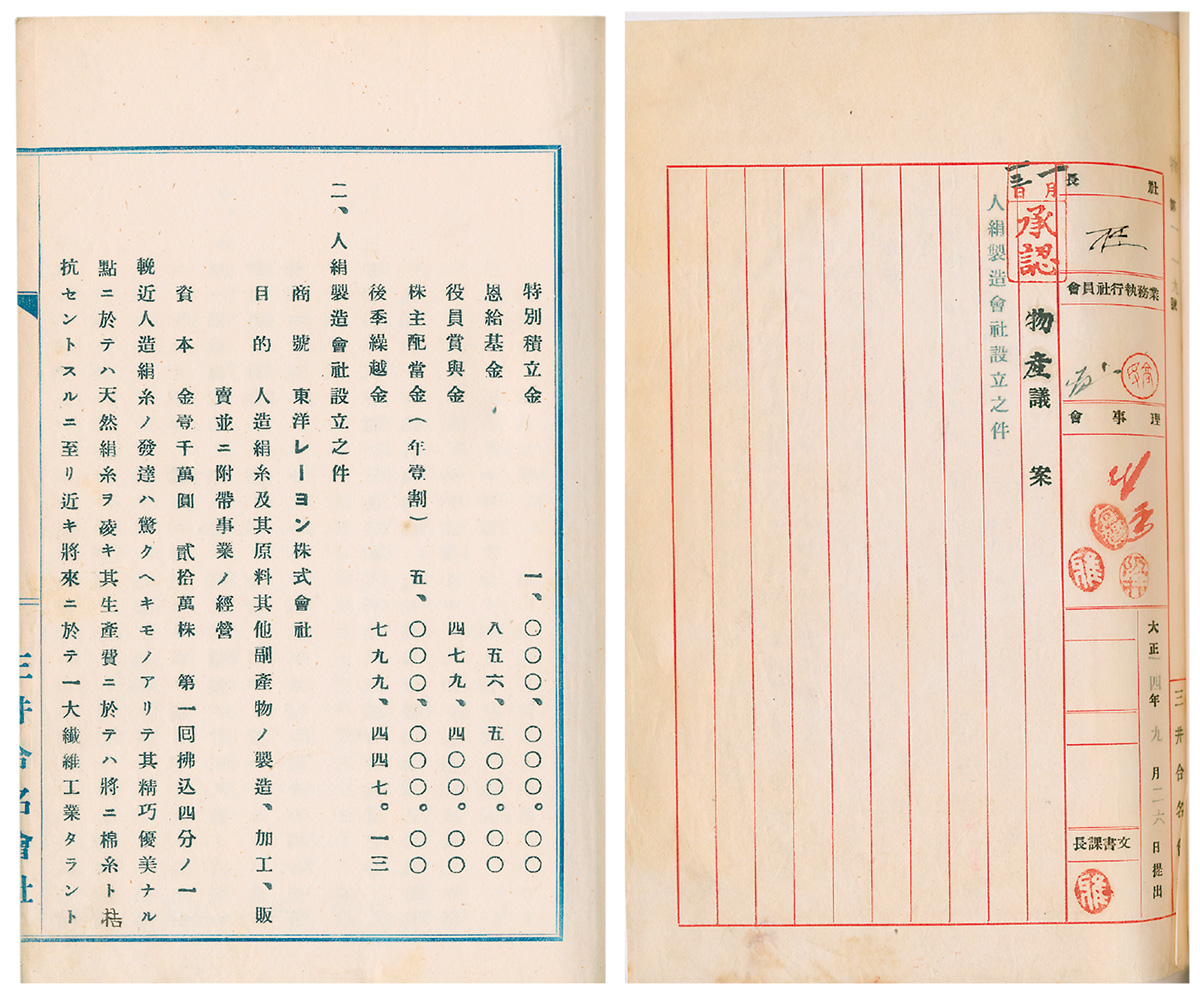 右は、三井合名会社議案用箋。三井物産から大正14年(1925)9月26日に提出された議案が、翌年1月13日に三井合名会社で承認されている。通常は提出から数日内に、三井合名会社の承認が得られるが、この議案については3ヶ月余りの月日を要している。