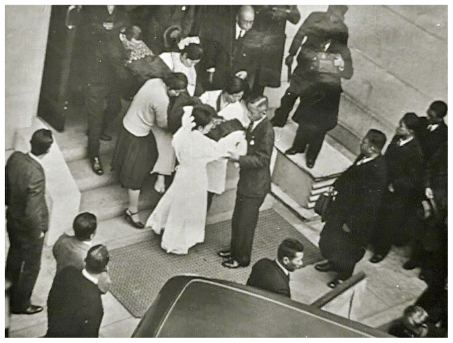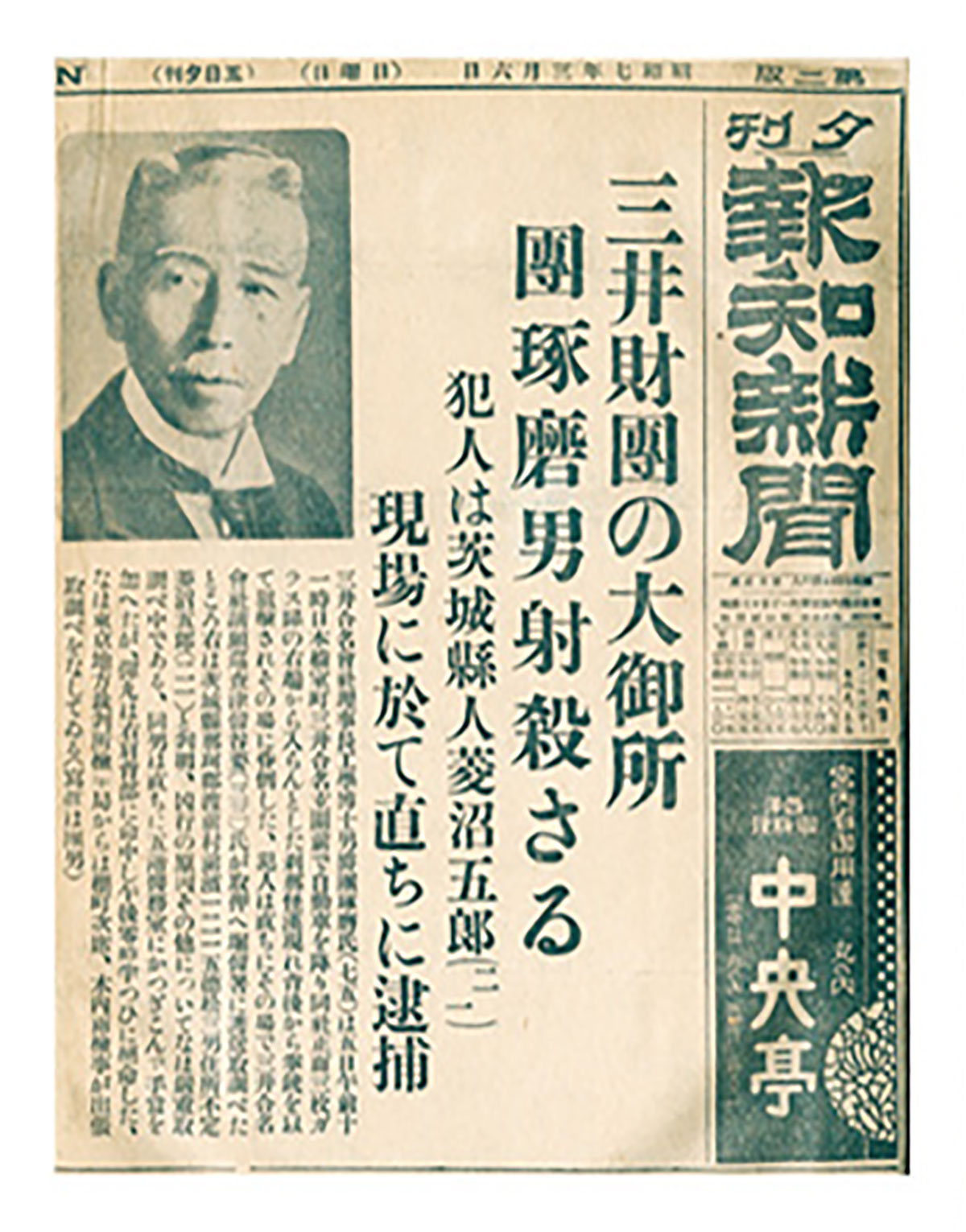 昭和7年(1932)3月5日、三井合名会社理事長の団?磨が暗殺された。午前11時25分頃、三井本館三越側玄関(三井銀行入口)の石段をのぼりかけた団に、血盟団員の若者が接近し、隠し持った拳銃を右胸部に向けて発射した。団はすぐに本館五階の医務室に運ばれ、手当てを受けたが、まもなく絶命した。1ヶ月前にも、井上準之助元蔵相が殺害されており、あわせて「血盟団事件」としてよく知られている。上の図版は、事件の翌年に三井鉱山本店が製作した「団理事長を葬ふ」という記録映画から切り出したもの。撮影は松竹キネマ。映画は、暗殺された日に団が自宅から車で出勤する再現シーンからはじまり、現場の本館玄関の様子、遺体を運び出す静止画へと続く、ストーリー仕立てになっている。財界の重鎮であった団に対する襲撃事件は、当時の日本の世相を反映した出来事であり、世界中に驚きをもって報じられた。