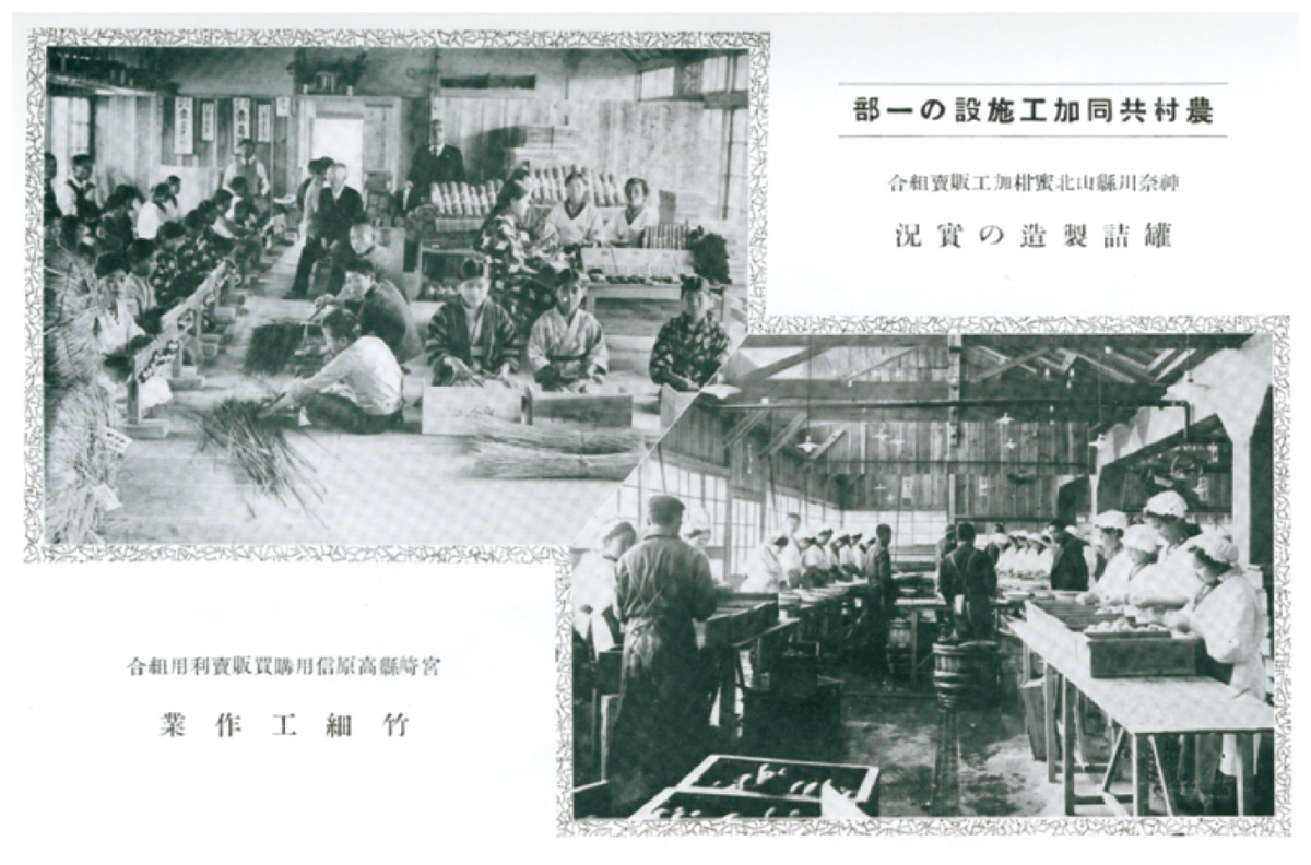 左は宮崎県高原町での竹細工作業風景、右は神奈川県山北町での缶詰製造の作業風景。