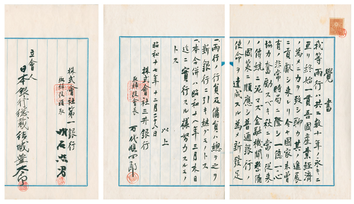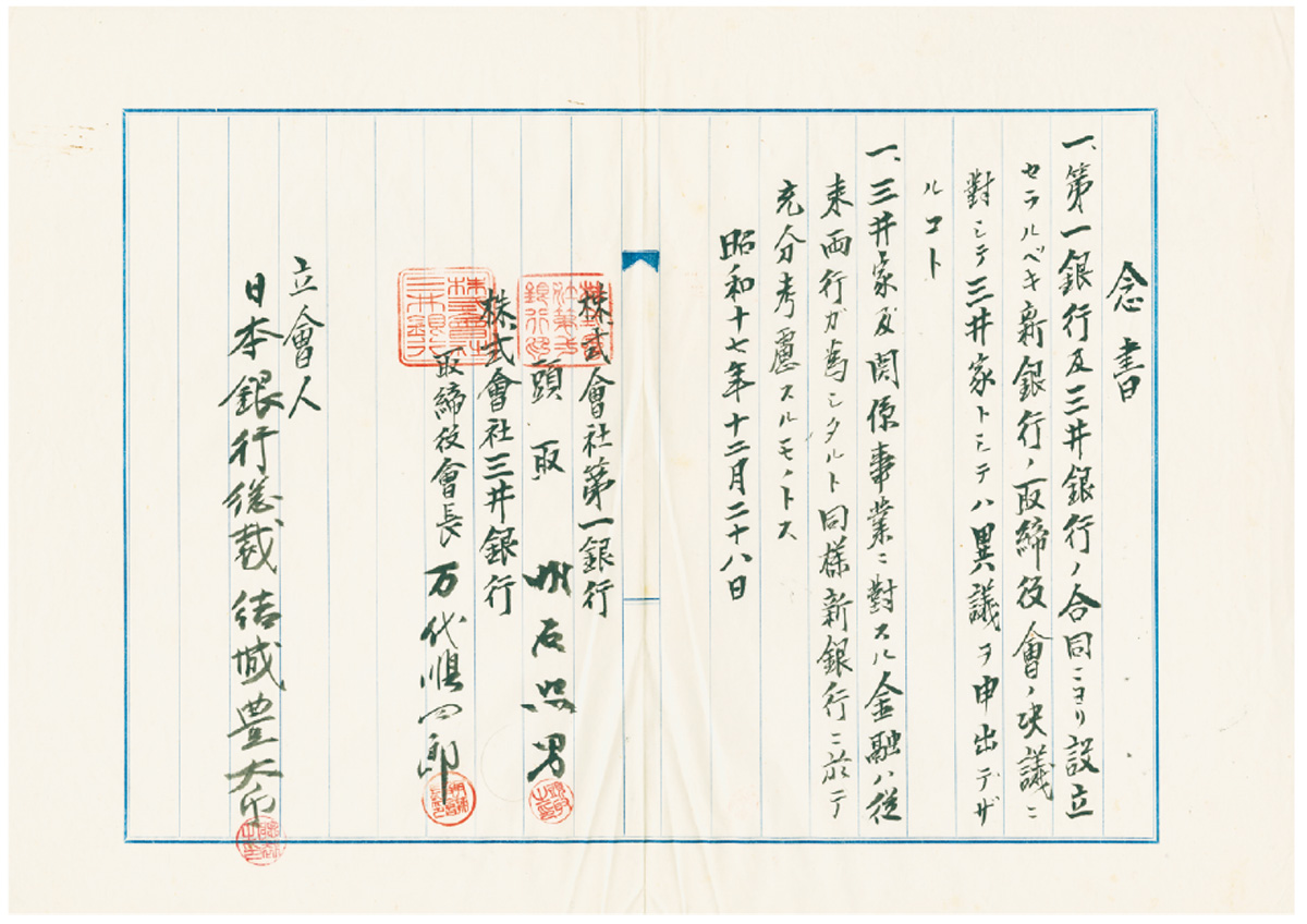 昭和17年(1942)12月17日、万代が日銀総裁の結城豊太郎を訪問した際、再び第一銀行との合併案が持ち上がる。22日、日銀副総裁・渋沢敬三(第一国立銀行の頭取であった渋沢栄一の孫)の仲介のもとで、万代と明石が会談し、その数日後には、両者の間で合併の基本条件が取り交わされた。わずか2時間のうちに、対等合併、新名称の採用など、10か条の合併要項が決められたといわれている。下の解説でふれるように、万代と明石が「覚書」と「念書」に調印したうえで、翌18年1月、三井銀行と第一銀行は合併契約を締結し、3月に帝国銀行が発足した。さらに翌年、帝国銀行は、大蔵省の決定にもとづいて、明治10年(1877)に華族が結集して設立した十五銀行を吸収合併する。