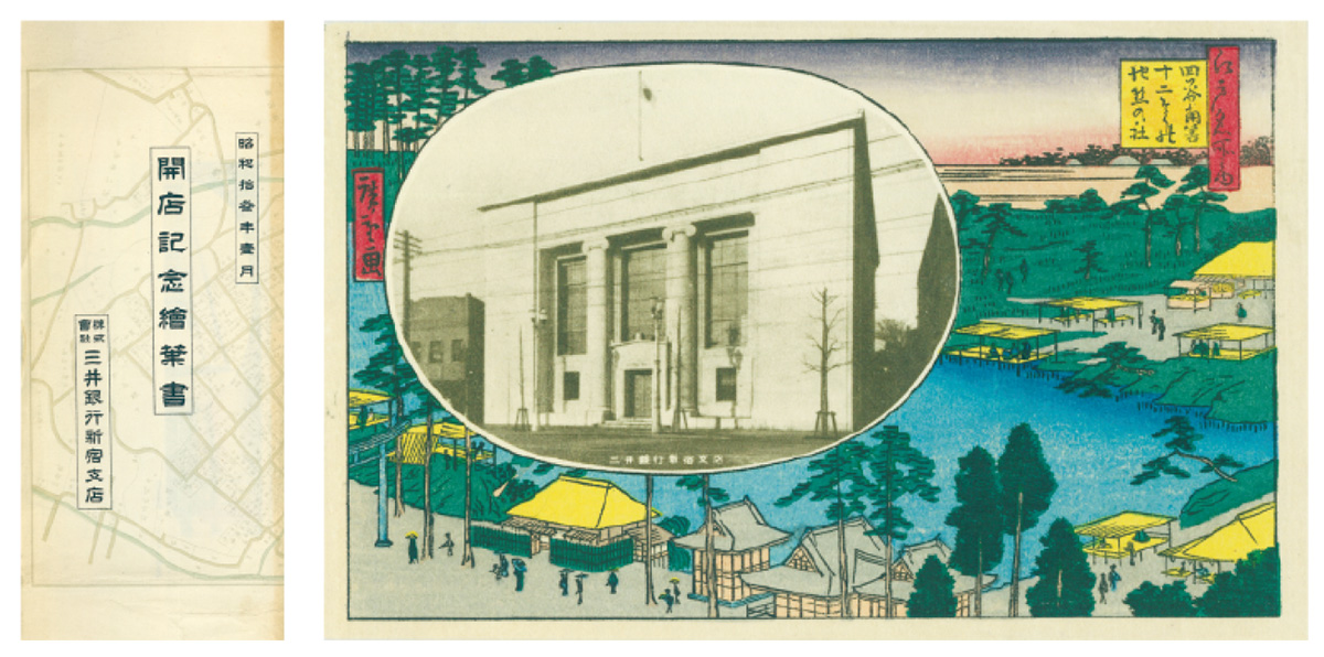 昭和10年代に入ると、三井銀行は営業方針を転換し、支店を増設して大衆預金を獲得するとともに、貸し倒れリスクの高い中小商工業金融への進出を図っていく。その最初の試みが、昭和13年(1938)に開店した新宿支店であった(→新宿支店開設記念はがき)。日中戦争が勃発し、三井系の諸企業を中心に資金需要が急増したため、その後も池袋支店、目黒支店、五反田支店など、東京で次々と支店を開設していった。ただ、他行も同様に店舗数を増やしており、支店の拡張に出遅れた三井銀行の預金額は、他の有力銀行にその差を引き離されていく。