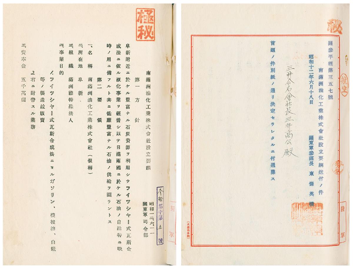 この記事は、昭和12年(1937)6月18日付で関東軍参謀長東条英機が三井合名会社の社長・三井高公にあてた人造石油会社の設立要綱(冒頭のみ)。この会社は「満州合成燃料株式会社」と名称を変更して設立されるが、三井鉱山は関東軍の要請をうけて、三井合名会社・三井物産とともに同社へ出資し、その工場建設・経営を担当することになる。石炭業で発展をつづける三井鉱山は、戦局が激しくなるにつれて、このような国策的な事業に資金を投入せざるをえず、その他軍需品生産の拡充や南方への進出など、軍との関係は切り離せないものとなっていく。