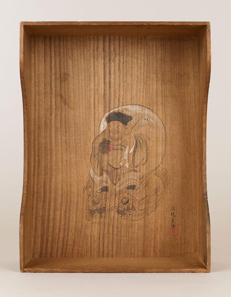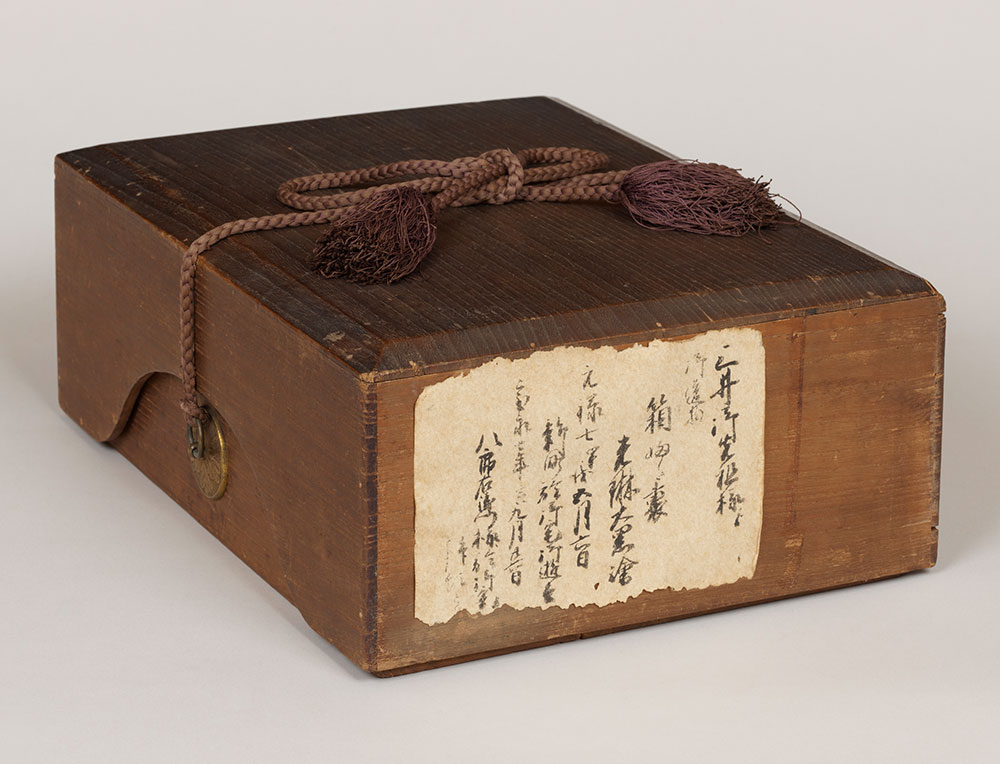 元禄7年(1694)に没した高利(法名:松樹院)所用の遺品を納めた箱である。高利の遺品は越後屋の幹部たちにも分配されており、箱の貼札には宝永7年(1710)の拝領品である旨が記される。真贋には検討を要するが、蓋裏には尾形光琳(1658~1716)の筆と伝わる大黒天図があり、大切な形見の品々を納める箱を、当時の京を代表する大画家・光琳の絵で飾りたいという、先祖への思いがしのばれる。
