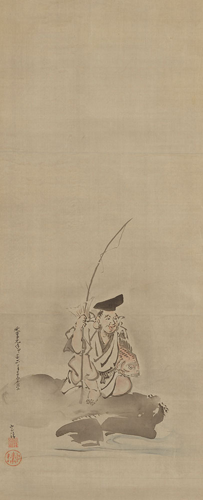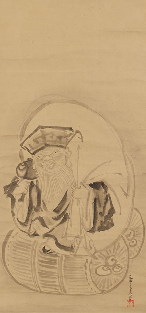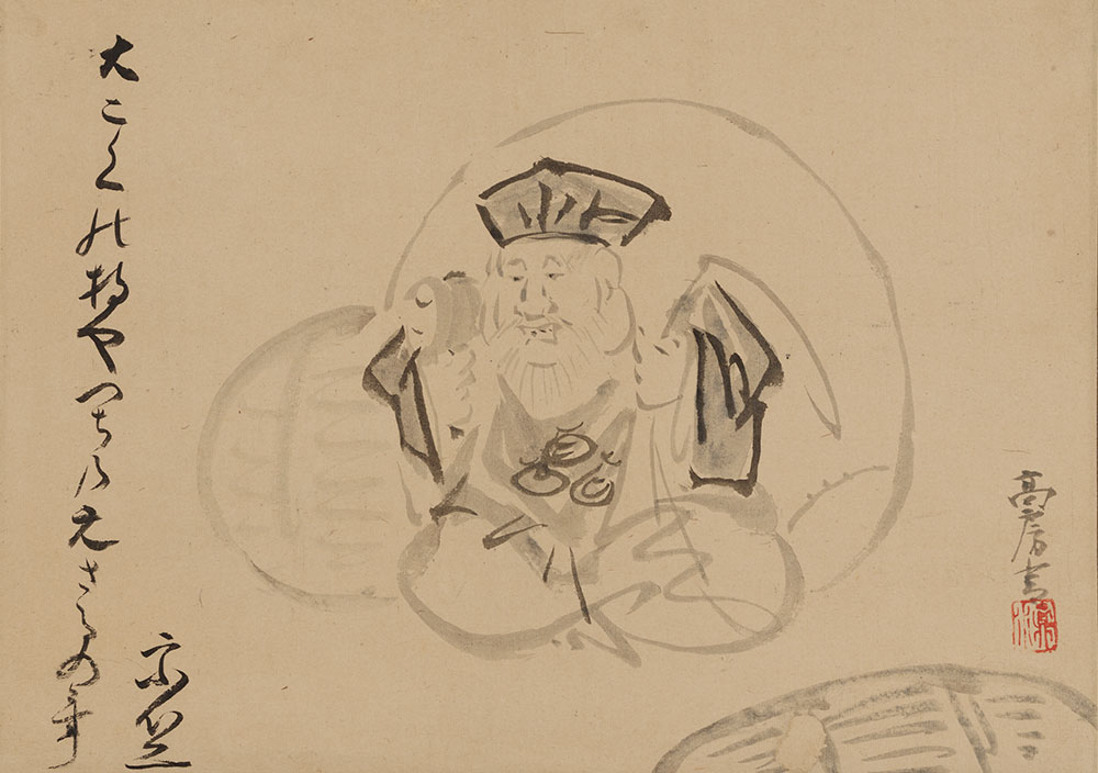 高房が描いた大黒天で、高平による『大こくの持やつちのえさるの年 宗竺』の句が添えられている。戊申の年は、享保13年(1728)年にあたる。打出の小槌を持ち、大きな袋を背負い、米俵の傍らに座る大黒天は、親しみのある表情で味わい深い。商売繁盛の神として知られる大黒天と恵比寿は、三井家が特に篤い信仰を寄せていた。