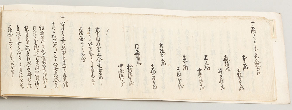落合七太夫(七郎太夫)元吉から、実子である落合権太夫吉久に、伊勢御師の担当地域を引き継ぐ証文。元吉は高利の祖父・高安の次男で、高利にとって叔父にあたる。3歳のとき伊勢山田の御師、落合藤太夫吉次の養子となり、のち家督を相続して七郎太夫と名乗ったという。落合氏は明治時代に入ると御師としての役割を終え、その後血統は絶えたという。