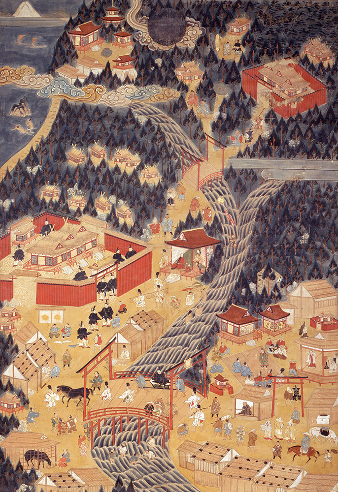 右幅には、上部に金色の日輪が配され、外宮の神域と参詣ルートが描かれる。右幅下から、宮川と山田の町、世義寺と子良館、外宮正殿、背後の山から岡本町が描かれる。