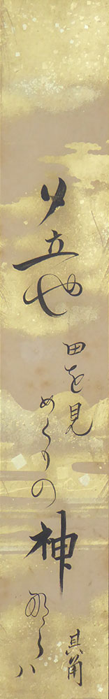 三囲神社が江戸の名所となる契機を作った、宝井其角の句「夕立や 田を見めぐりの神ならば」の短冊である。越後屋から見て北東に位置する三囲神社は、鬼門除けとして享保年間(1716~36)前後より、三井家で信仰された。また「囲」の字が三井の「井」を含む点も験担ぎとされたようである。三井家とその組織は時代を通じ、社殿等の修理・改築を支援したほか、現在も三越各店に勧請され祀られており、同家との縁の深さを物語っている。