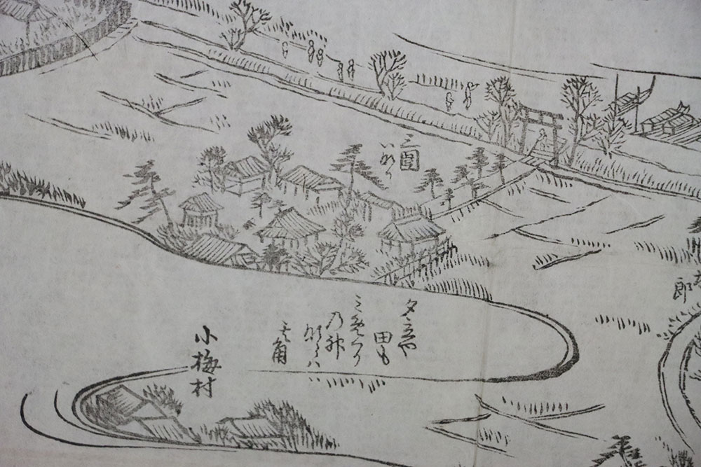隅田川沿いの寺社や古跡を描いた絵地図の摺物で、文化元年(1804)に佐原菊塢が開いた、向島百花園が中心的に紹介される。画面左端中央に「三囲いなり」が描かれ、江戸中期に当地が名所化する契機となった其角の句「夕立や 田を(本図では「田も」)見めぐりの神ならば」が添えられる。筆者の野々山?山(1780~1848)は狩野美信に学んだ江戸の絵師で、酒井抱一主催の文化12年の光琳遺墨展に手鑑を出品する等、江戸の文人との交流も認められる。