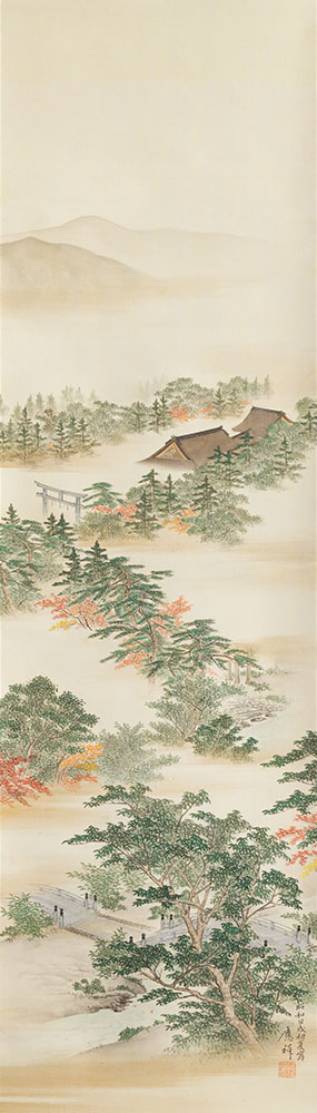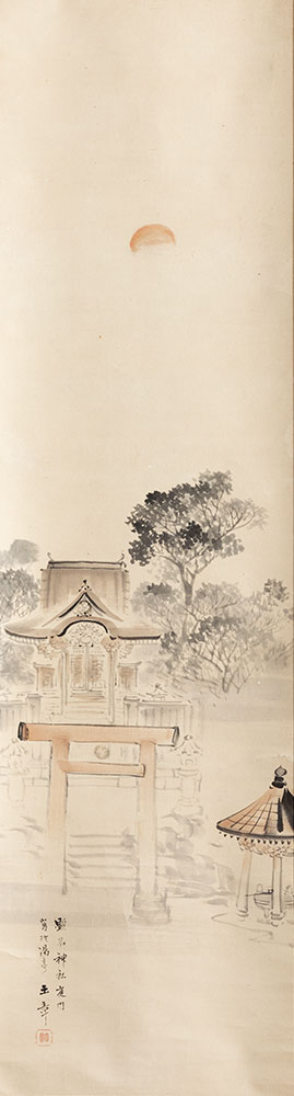 「顕名神社庚門 寫於湯亭」とあり、淡白な画風ながら、鳥居から見た顕名霊社の旧社殿・手水舎が的確に表されている。款記に見える「湯亭」が指す場所については未詳である。川端玉章(1842~1913)は明治期の円山派の日本画家。もと三井の奉公人で、画才を見出されて絵師となる。東京美術学校で教鞭を執ったほか、三井家の邸宅を飾る障壁画も手掛けた。