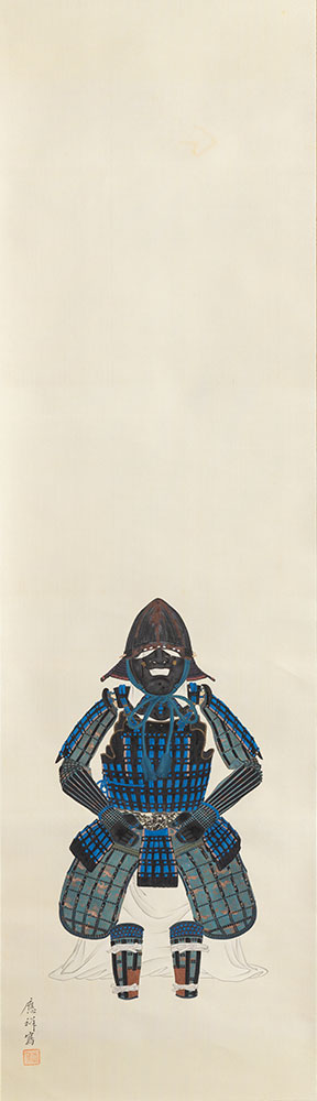 顕名霊社は遠祖・三井越後守高安をはじめ、没後百年を経過した、三井家の先祖夫妻を祀る祖霊社。廃仏毀釈や戦争等により各所を転々とし、現在は東京の三囲神社の一角に設けられている。本図は顕名霊社と、御神宝として祀られた伝高安着用の甲冑を三幅対で描く。漆の剥落など含め、現物を精緻に写しとろうと試みている。