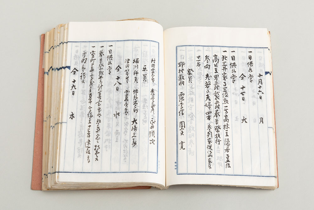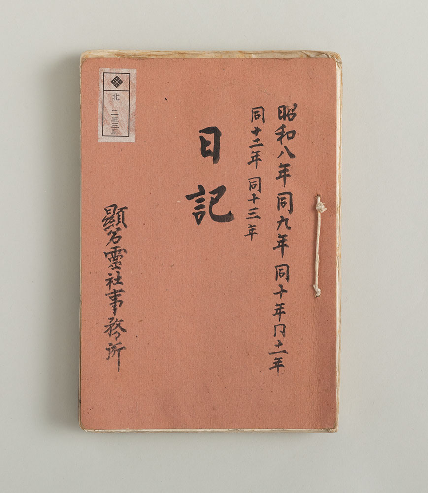 顕名霊社の社務所の作成した日誌である。明治42年(1909)から昭和21年(1946)まで、社務に関する事柄を簡単に記す。祖先を祀る遠忌の祭礼など、特記すべきイベントのあった際は情報量がやや多い。ここに掲げたページには昭和8年(1933)10月に顕名霊社で挙行された三井高公(北三井家十一代当主)の男爵襲爵奉告祭の記事を含み、参加者などが簡単に記されている。